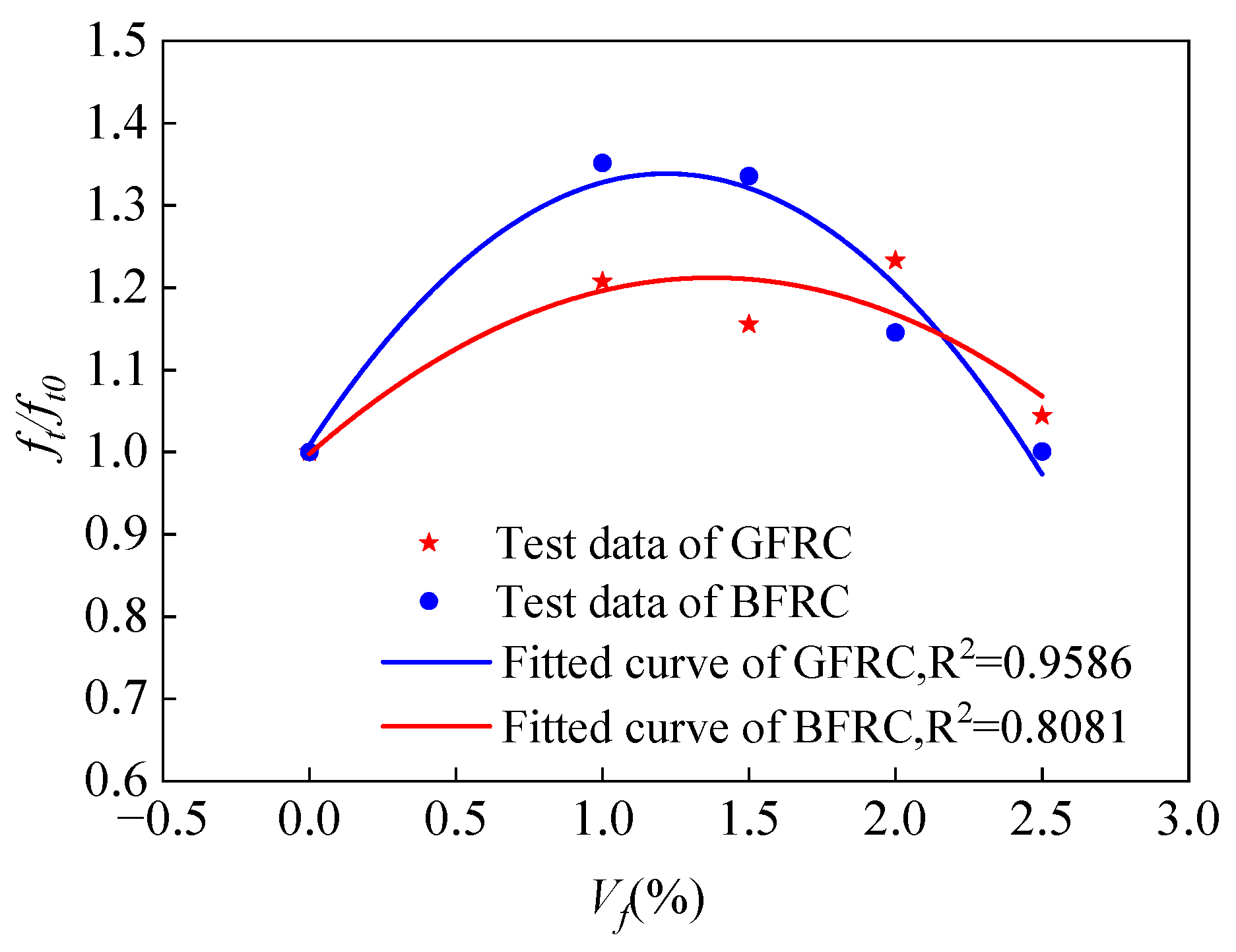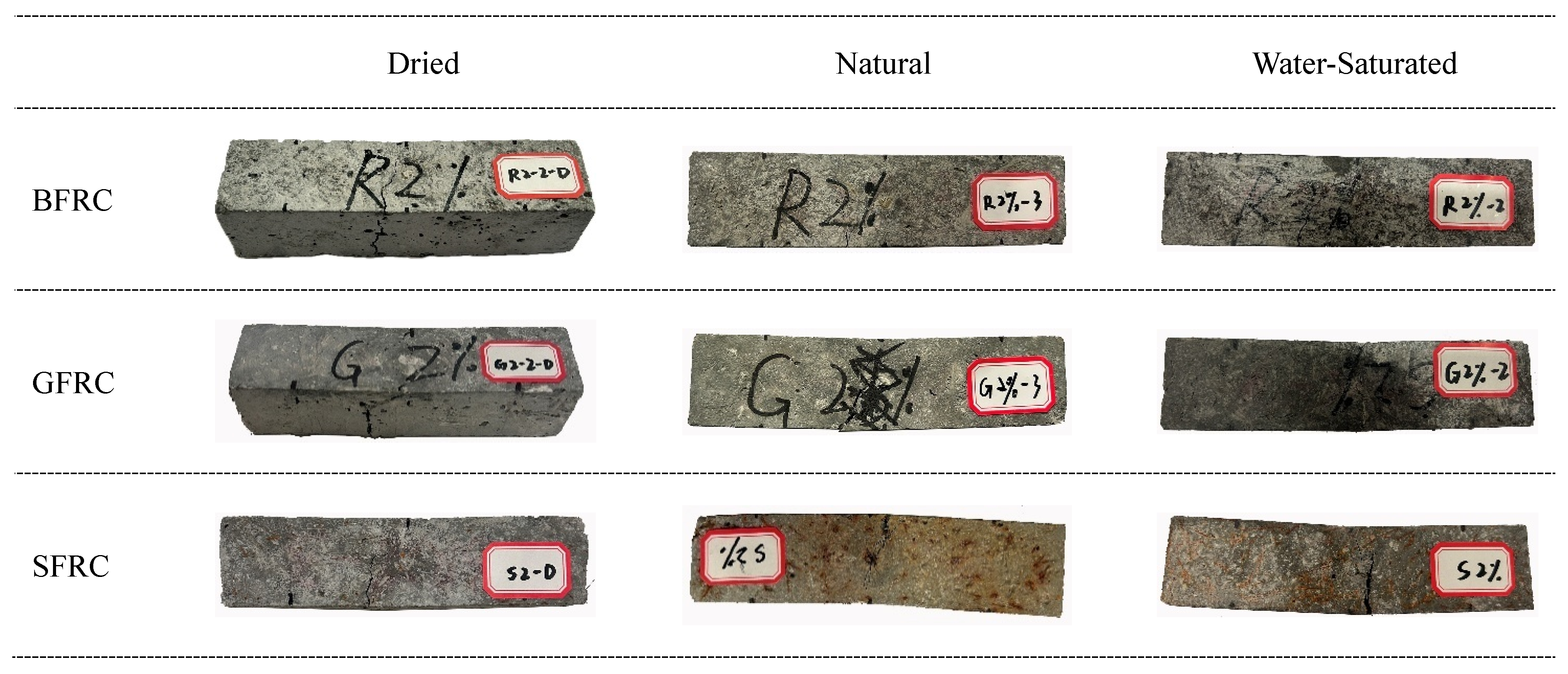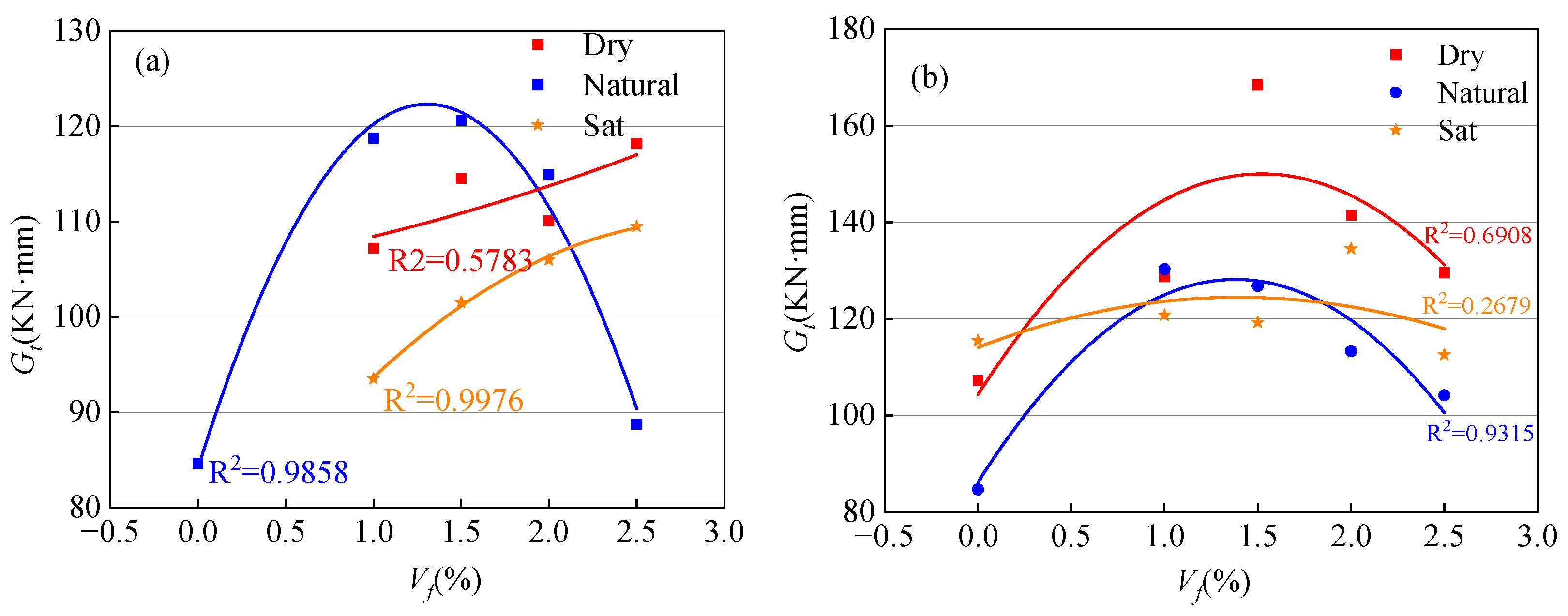 - The optimal fiber volume fraction was identified as 1%, at which FRC exhibited the best performance. Relationships between fiber volume fraction, flexural strength, and fracture energy were established. The fitting equations yielded good results under natural moisture conditions but were less satisfactory under dry and saturated conditions.