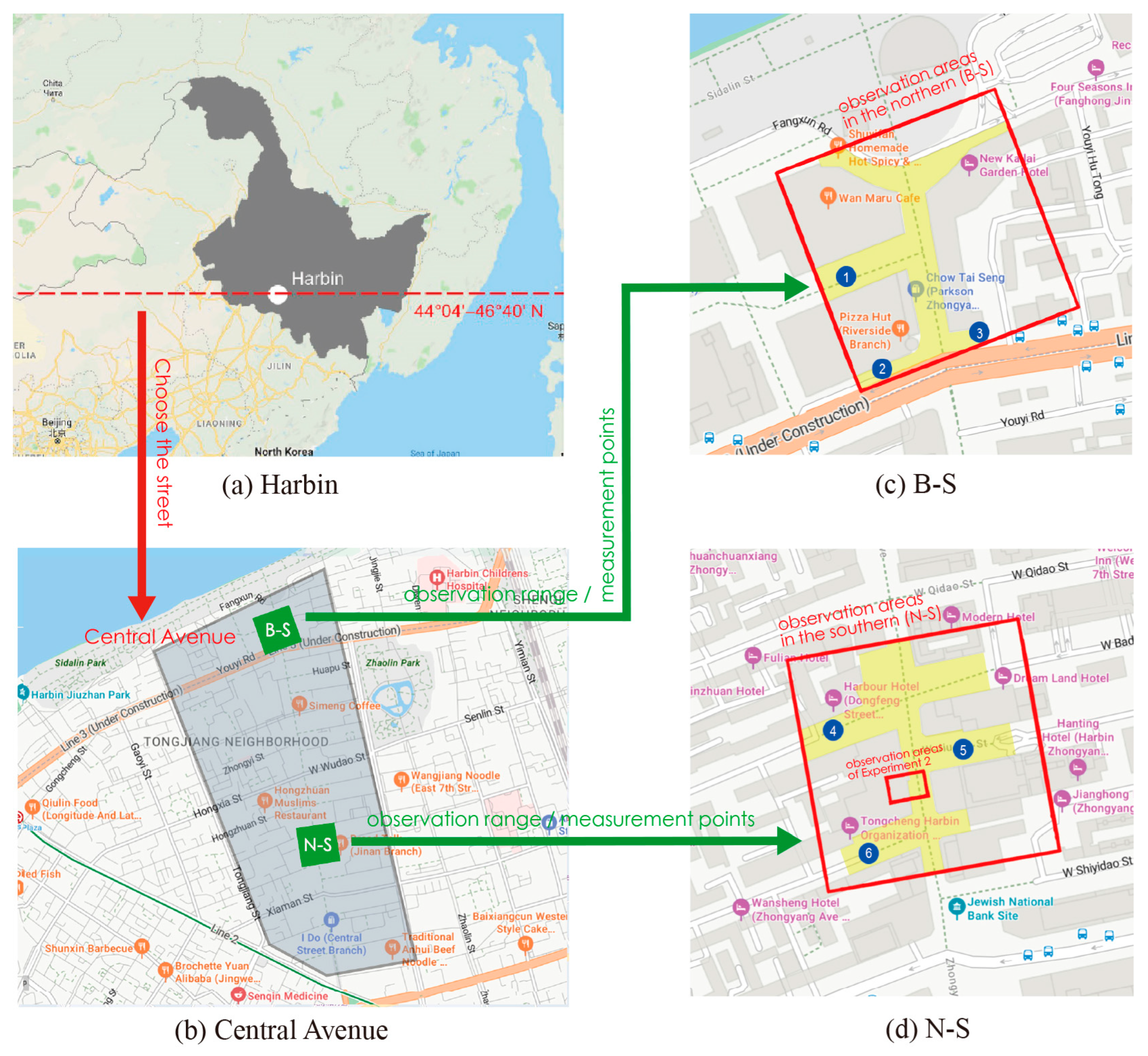 - Jin, H.; Liu, S.; Kang, J. Thermal Comfort Range and Influence Factor of Urban Pedestrian Streets in Severe Cold Regions. Energy Build. 2019, 198, 197–206. [Google Scholar] [CrossRef]