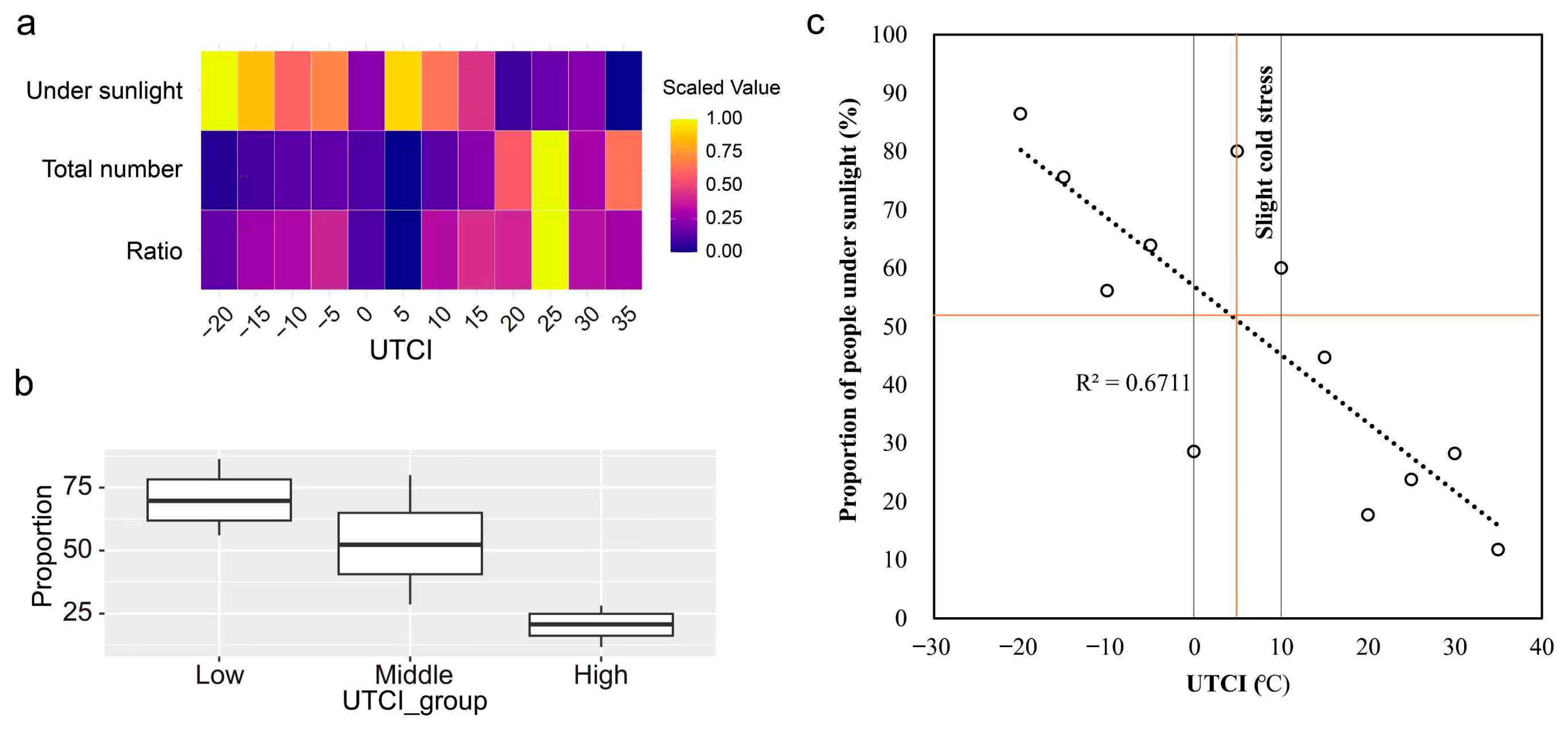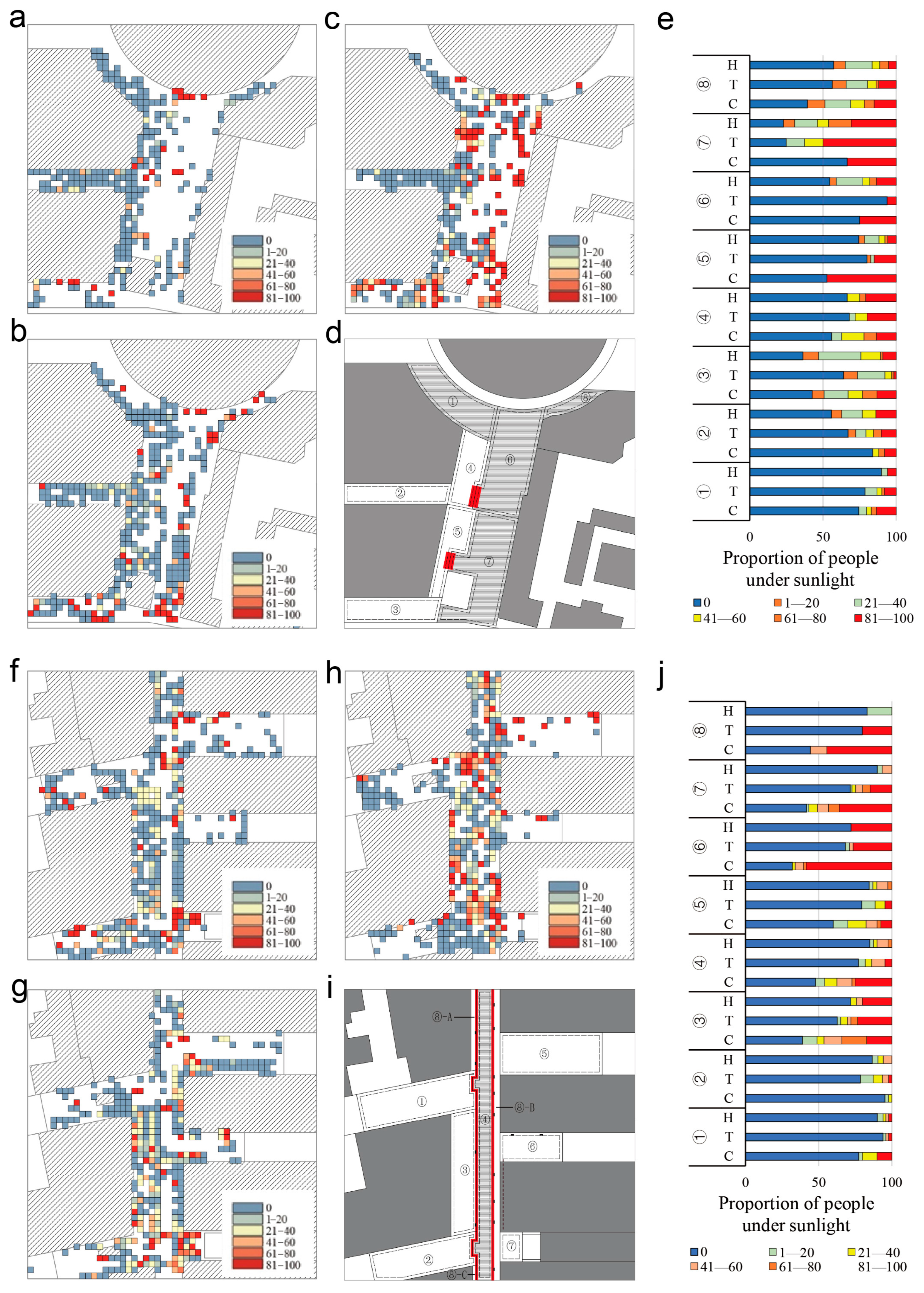 - The crowd is attracted by commercial activities. For example, some streets in certain directions or locations are almost always in the shade; however, due to the attraction of commercial activities, crowds will gather even in uncomfortable environments. In such cases, the influence of sunlight exposure on crowd distribution is overridden, making it difficult to establish a direct relationship.