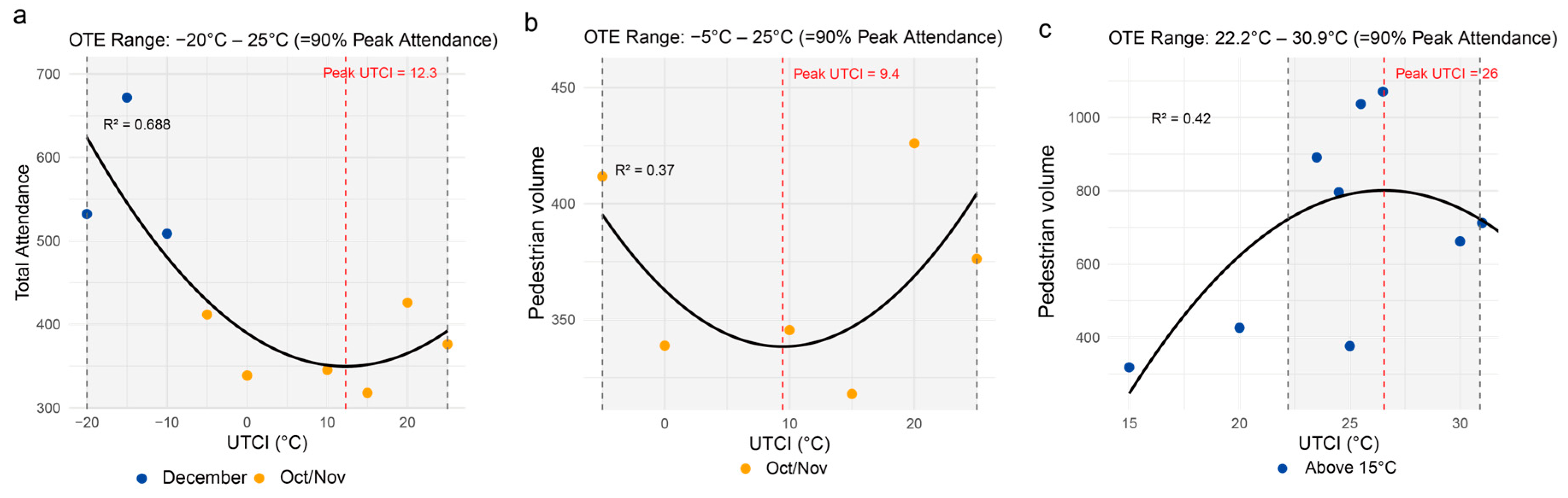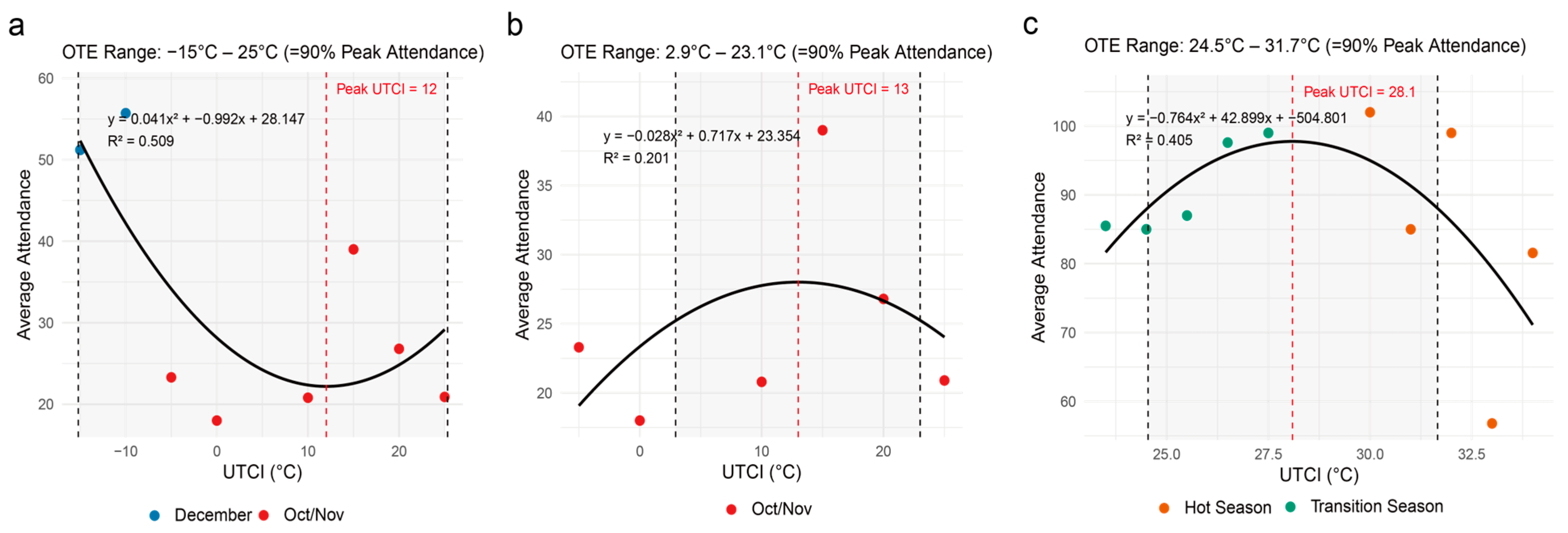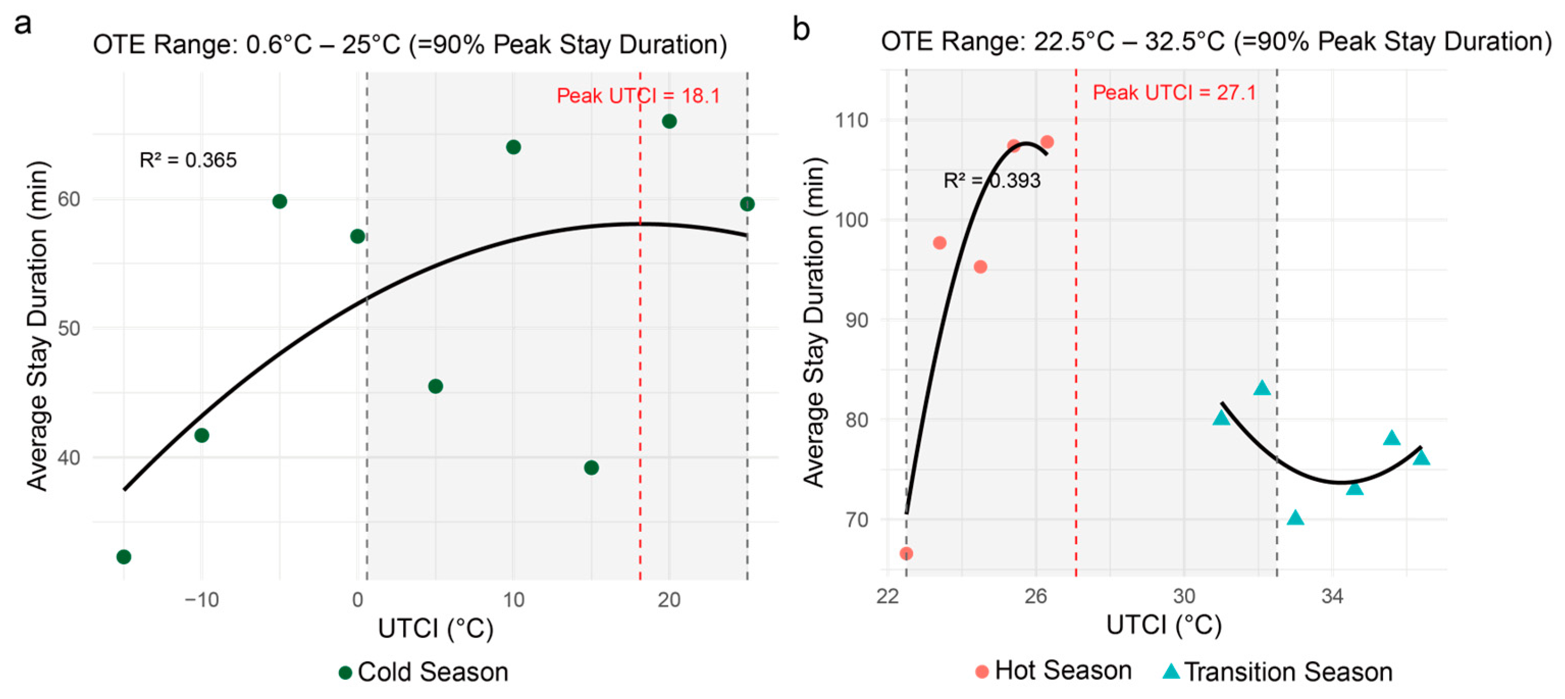 3.1.2. Thermal Comfort and Attendance Patterns Across Seasons on Central Avenue