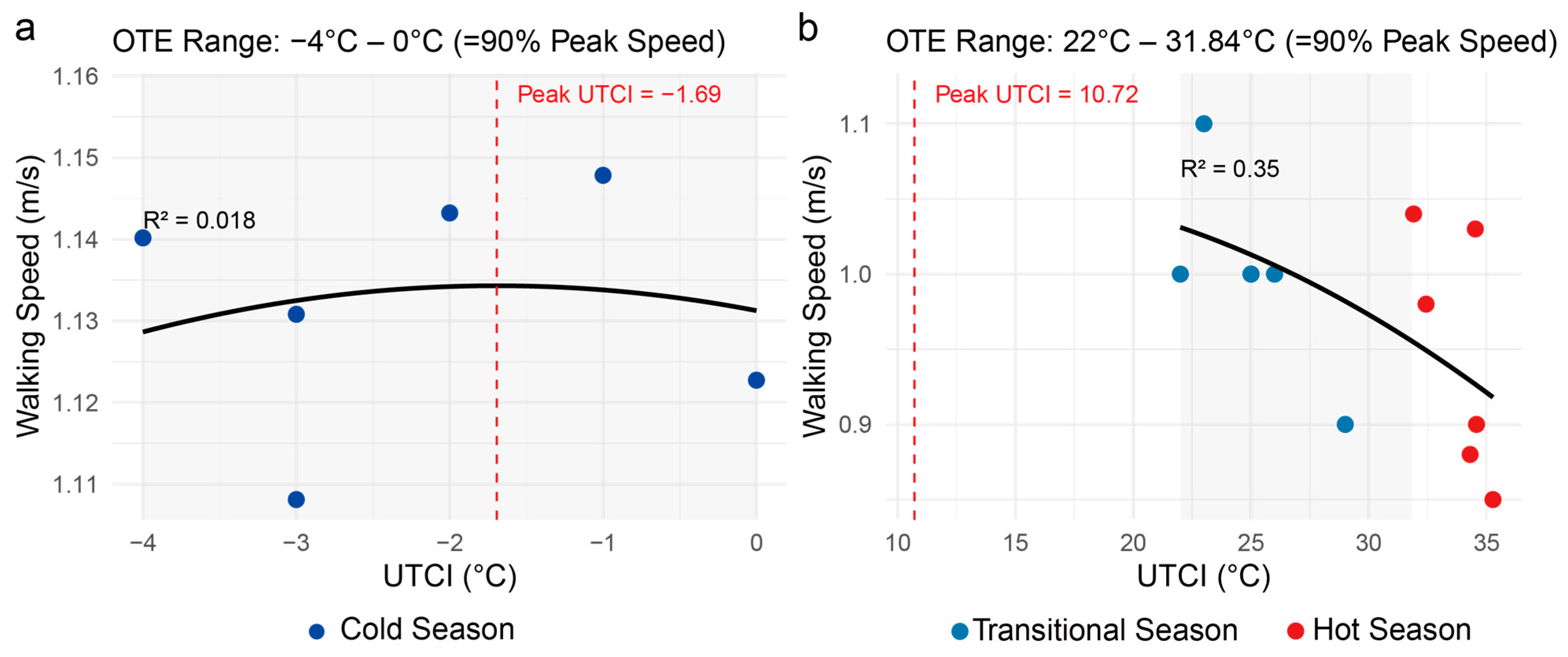 - Walking speed in Harbin is lower than in other regions across all observed seasons. Based on the above analysis, this phenomenon may be attributed to the high metabolic rates of local residents, which are required to cope with extreme cold conditions.