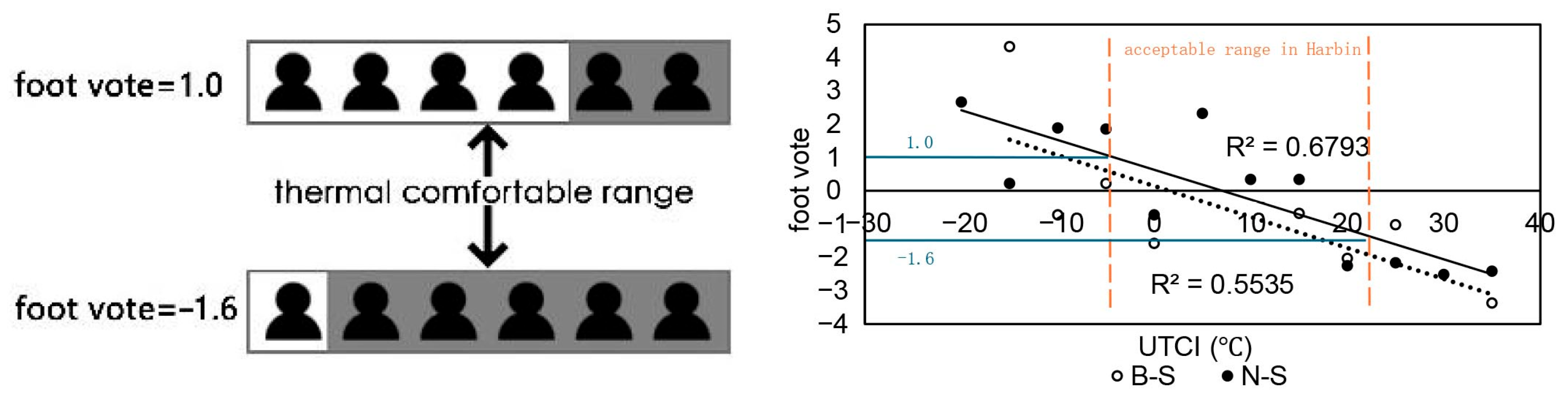 Liu S, Jin H. Spatial Usage Rate Model and Foot Vote Method for Thermal Comfort and Crowd Behaviour Analysis in Severe Cold Climate City Design. Buildings. 2025; 15(21):3812. https://doi.org/10.3390/buildings15213812