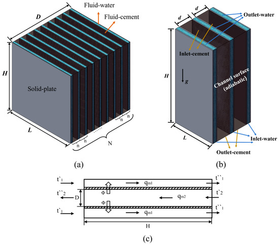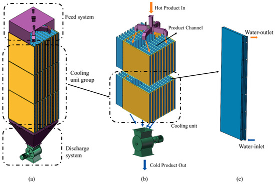 (a) The configuration of the proposed layered-plate heat exchanger, (b) the flow path of high-temperature cement powder, (c) the structure of a cooling plate.