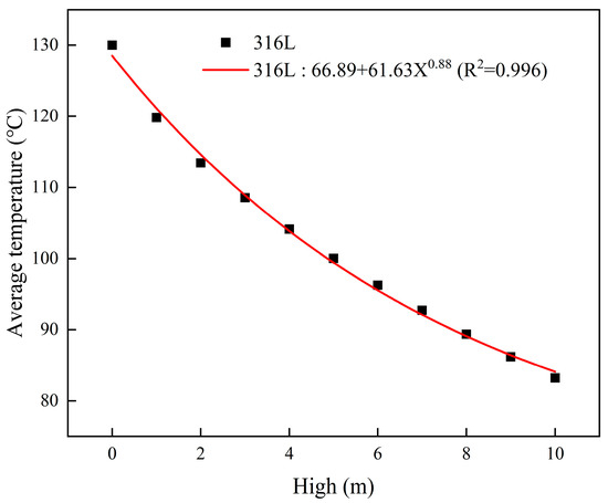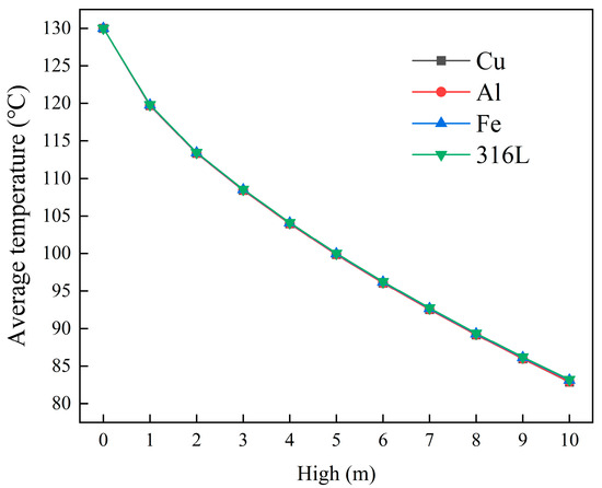 Figure 4 presents the simulation results for the average outlet temperature of the cement powder flow across 10 different heights of the cooling unit group and 4 different types of cooling plate materials. Table 2 shows the characteristics of these materials. As the height of the cooling unit group increased, the average outlet temperature of the cement powder flow decreased. In contrast, variations in cooling plate material exhibited minimal impact on the average outlet temperature. Increasing the height of the cooling unit group extended the residence time of high-temperature cement powder, facilitating effective heat exchange between the cement powder and cooling water, thus improving overall cooling efficiency. Figure 5 presents the fitted relationship between the heat exchanger height and the average outlet temperature of cement when 316L stainless steel is used as the cooling plate material. The results indicate that when the height exceeds 10 m, the outlet temperature continues to decrease, and the cooling efficiency further improves. As the height increases, the temperature of the cement powder gradually approaches that of the cooling water, with the system’s cooling efficiency reaching its maximum and eventually plateauing. Additionally, the thermal resistance values of the different cooling plate materials remained on the order of 10−4 (m2·°C)/W or above (Table 2), indicating that changing the cooling plate material had a minimal impact on heat transfer efficiency.