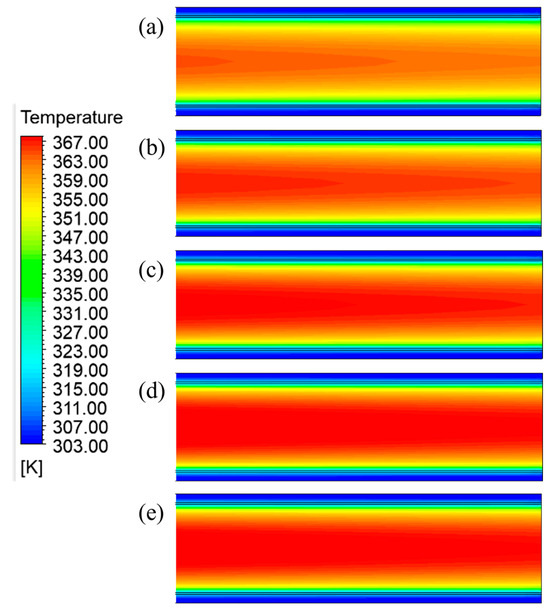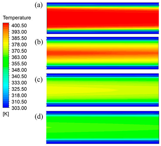 Figure 6 shows the temperature distribution across the central cross-section of the cement powder flow, measured within 0.5 m of the outlet, across different heights of the cooling unit group equipped with cooling plates constructed from 316L stainless steel. High-temperature regions were concentrated in the center of the product channels, decreasing radially toward the cooling plates. This radial temperature gradient indicated effective heat transfer. As the height of the cooling unit group increased, the area of high-temperature regions significantly decreased, indicating improved cooling efficiency. This finding supported the conclusion that the height of the cooling unit group had a greater impact on temperature control compared to material selection, as previously illustrated in Figure 4. Table 3 presents the average outlet temperatures of the cement powder flow across different heights of the cooling unit group equipped with cooling plates constructed from 316L stainless steel. Cooling efficiency improved as the cooling unit group height increased: 7.83% at 1 m, 19.90% at 4 m, 28.66% at 7 m, and 35.99% at 10 m.