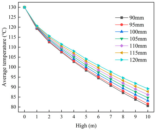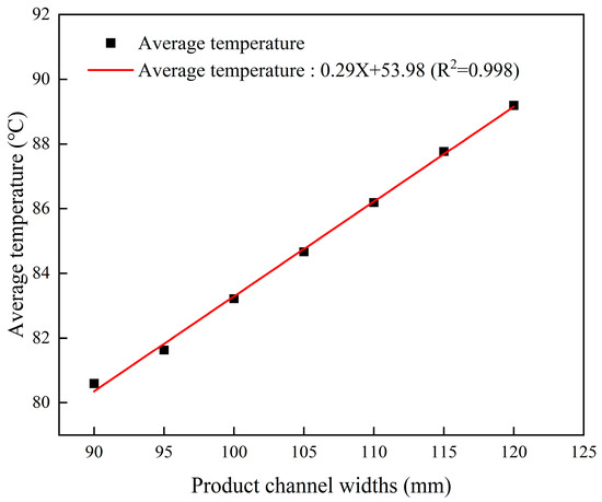 The effects of varying product channel widths on cooling efficiency were investigated using cooling plates constructed from 316L stainless steel. Figure 7 presents simulation results depicting the average outlet temperatures of the cement powder flow across 10 different heights of the cooling unit group and 7 different widths (d) of the product channel. Figure 7 reveals a negative relationship between product channel width and cooling efficiency: as the channel width increases, cooling efficiency tends to decrease. Figure 8 presents the fitted correlation between material channel width and the average outlet cement temperature at an exchanger height of 10 m. When the number of product channels and the cement powder treatment capacity were maintained constant, increasing the channel width expanded the inlet area. This expansion slightly reduced the feed velocity and increased the residence time of cement powder, which was expected to enhance cooling efficiency. However, a wider channel promoted the formation of a thicker boundary layer near the cooling plate surface, increasing the thermal resistance of the cement powder flow. Table 4 presents the average outlet temperatures of the cement powder flow across different cooling unit group heights and product channel widths. At a cooling unit group height of 10 m, the cooling efficiencies for the product channel widths of 90, 100, 110, and 120 mm were 38.00%, 35.99%, 33.70%, and 31.39%, respectively.