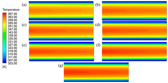 Temperature distribution across the central cross-section of the cement powder flow, measured within 0.5 m of the outlet and at a cooling unit group height of 10 m, across different product channel widths ((a–g): 90, 95, 100, 105, 110, 115, and 120 mm, respectively).