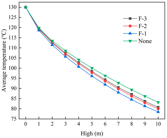 Figure 12a–d display the temperature distribution across the central cross-section of the cement powder flow, measured within 0.5 m from the outlet and at a cooling unit group height of 10 m, across different fin configurations. The presence of fins significantly reduced the area of high-temperature regions, with the reduction becoming more pronounced as fin spacing decreased. Figure 12e–g display the temperature distribution on the fin surfaces under the same cooling unit group height for different fin configurations. Smaller fin spacing promoted a wider distribution of high-temperature regions on the fin surfaces, indicating a higher degree of participation in heat transfer. Table 6 presents the average outlet temperatures of the cement powder flow across different cooling unit group heights and fin configurations. At a cooling unit group height of 10 m, the use of fins with the spacings of F-3, F-2, and F-1 resulted in average outlet temperature reductions of 2.488, 3.235, and 4.788 °C, respectively, when compared to the reference condition without fins. Correspondingly, the cooling efficiency improved to 37.90%, 38.48%, and 39.67%, respectively. Increasing the fin length enlarges the heat transfer area; however, excessively long fins can reduce the temperature difference at the tip, thereby decreasing the heat transfer efficiency. Moderately increasing the fin thickness can lower thermal conduction resistance, but overly thick fins reduce the flow cross-sectional area and increase pressure drop. Therefore, by appropriately optimizing the fin length, thickness, and spacing, a balance between enhanced heat transfer and controlled flow resistance can be achieved, effectively improving the overall heat transfer performance.