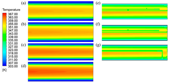 (a–d) Temperature distribution across the central cross-section of the cement powder flow, measured within 0.5 m of the outlet and at a cooling unit group height of 10 m, across different fin spacings ((a–d): 100 mm, 200 mm, 300 mm, and no fins, respectively). (e–g) Temperature distribution on the fin surfaces at a cooling unit group height of 10 m for different fin spacings ((e–g): 100 mm, 200 mm, and 300 mm, respectively).