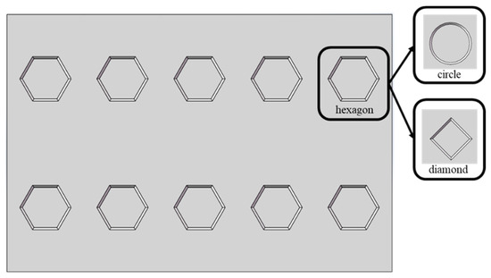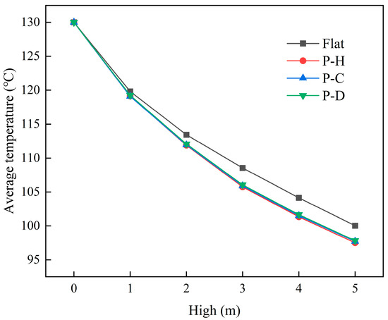 The morphology of cooling plates with three distinct surface shapes, which were installed in the cooling unit group with a height of 1 m, is illustrated in Figure 13. The primary distinction among the three cooling plate surface shapes was their groove shape, which was hexagonal, circular, or diamond-shaped, denoted as P-H, P-C, or P-D, respectively. Figure 14 presents the numerical simulation results for the average outlet temperatures of the cement powder flow across three different cooling plate surface shapes and five different cooling unit group heights. Compared to cooling plates with flat surfaces, those with grooves exhibited superior heat exchange capabilities. However, the difference in cooling efficiency among different groove shapes was minimal. The grooved surfaces not only increased the heat transfer area of the cooling unit group but also enhanced the complexity of the flow channel, thereby increasing cooling efficiency [26].