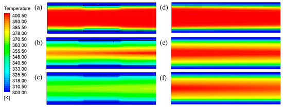 Figure 15a–f illustrate the temperature distribution across the central cross-section of the cement powder flow, measured within 0.5 m of the outlet and at different cooling unit group heights, for P-H and flat cooling plate surface shapes, respectively. The temperature distribution analysis revealed that the area of the high-temperature regions gradually decreased as the cooling unit group height increased. Furthermore, at the same cooling unit group height, the high-temperature region on the P-H cooling plate was significantly smaller than that on the flat-surface cooling plate. Table 7 presents the simulation results for the average outlet temperature of the cement powder flow across different cooling plate surface shapes and cooling unit group heights. At a cooling unit group height of 5 m, cooling plates with grooves exhibited a 37.9% higher cooling efficiency compared to flat-surface cooling plates.