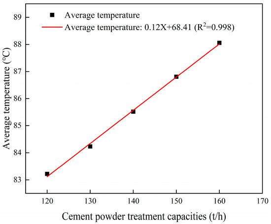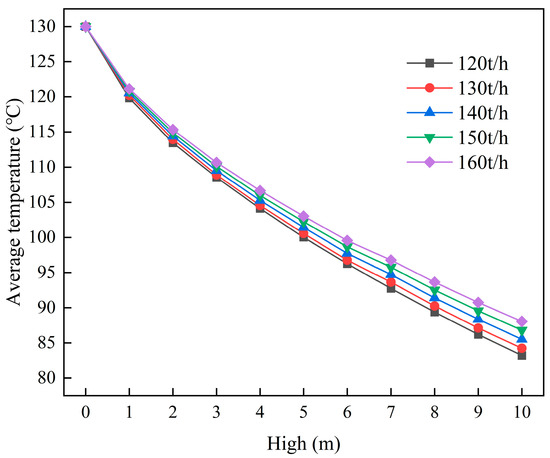Average outlet temperatures of the cement powder flow across different cooling water flow rates and cooling unit group heights.