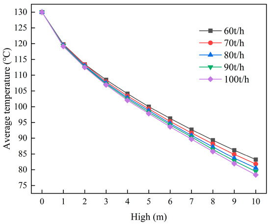 Figure 21 illustrates the temperature distribution across the central cross-section of the cement powder flow, measured within 0.5 m of the outlet and at a cooling unit group height of 10 m, across different cooling water flow rates. As the cooling water flow rate increased, the area of high-temperature regions decreased. Table 9 summarizes the simulation results for the average outlet temperatures of the cement powder flow across different cooling water flow rates and cooling unit group heights. At a cooling unit group height of 10 m, increasing the cooling water consumption from 60 t/h to 70, 80, 90, and 100 t/h enhanced the cooling efficiency from 35.99% to 37.08%, 38.03%, 38.88%, and 39.71%, respectively. The cement powder primarily flows under gravity, and the pressure drop is mainly concentrated on the cooling water side. Increasing the cooling water flow inevitably raises the required motor power. For instance, when the cooling water flow increases from 60 t/h to 100 t/h, the installed motor power must be increased from 7.5 kW to 11 kW.