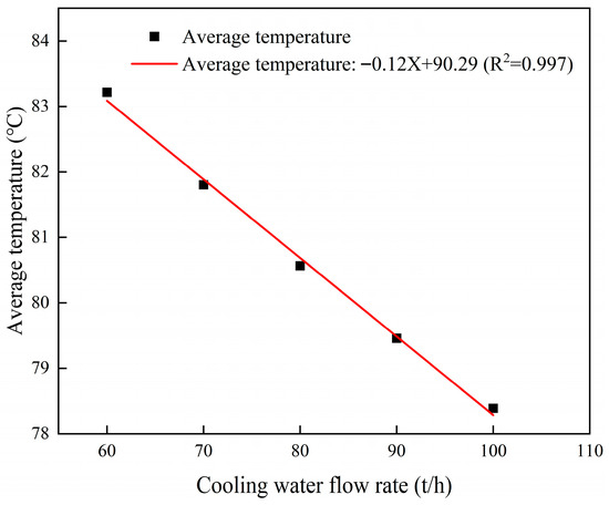 Fitted correlation between outlet cement temperature and cooling water flow rate at a cooling unit group height of 10 m.