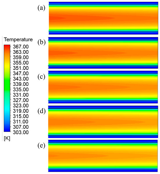 Temperature distribution across the central cross-section of the cement powder flow, measured within 0.5 m of the outlet and at a cooling unit group height of 10 m, across different cooling water flow rates ((a–e): 60, 70, 80, 90, and 100 t/h, respectively).