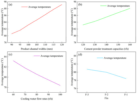 Figure 22, plotted based on the study data, illustrates the outlet temperature distribution under a cooling unit group height of 10 m as material channel width, fin spacing (F-3/F-2/F-1), cement powder processing rate, and cooling water flow rate. The results show that increasing the cooling water flow and reducing the fin spacing significantly lowers the outlet temperature, whereas increasing the channel width or cement processing rate leads to higher outlet temperatures. These findings confirm the synergistic enhancement of heat transfer performance achieved by the fin structure and cooling water flow.