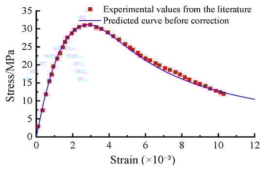 The majority of extant studies have overlooked the influence of concrete matrix strength grade on uniaxial tensile and compressive stress–strain curves. To address this limitation, an empirical formula was adjusted based on concrete with a matrix strength of C30. Initially, the uniaxial tensile and compressive expressions proposed by Wang et al. [] were employed to simulate experimental results. These expressions were subsequently refined using experimental data provided by Yang et al. []. A comparative analysis with Yang et al.’s results [] demonstrated that the modified uniaxial tensile and compressive expressions align reasonably well with the observed data. The corresponding findings are presented in Figure 1 and Figure 2.