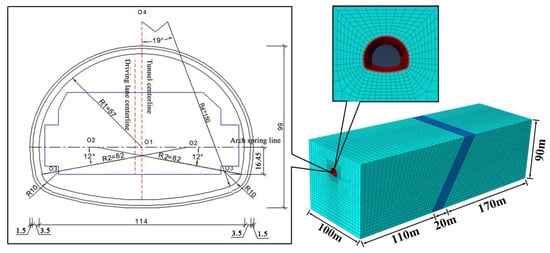A separated double-tunnel model was constructed, with a tunnel width of 12.4 m and a height of 9.9 m, as illustrated in Figure 3. In accordance with Saint-Venant’s Principle, the boundary distance from the tunnel center was set to 3–5 times the tunnel diameter. Consequently, the model width was set to 100 m, and the distance from the bottom boundary to the tunnel bottom was set to 60 m, with a tunnel burial depth of 20 m, resulting in a total model height of approximately 90 m. During the meshing process, both the fault fracture zone and the surrounding rock near the tunnel lining were refined to enhance numerical accuracy. The longitudinal length of the model was set to 300 m. The tunnel lining comprises a primary support and a secondary lining, with thicknesses of 0.15 m and 0.35 m, respectively, resulting in a total lining thickness of 0.5 m. The final model and mesh division are depicted in Figure 3.