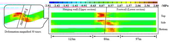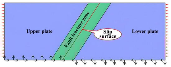 The top of the model is defined as a free boundary based on the fault movement simulation methodologies of Tao et al. and Qiu et al. [,], the top of the model is defined as a free boundary. A lateral displacement constraint aligned with the fault strike is applied, while normal displacement constraints are imposed longitudinally. The bottom of the hanging wall is subjected to normal constraints. Using the fault fracture zone center as the sliding interface, equal-magnitude but oppositely directed vertical and horizontal displacements are applied to the left and right bottom regions, simulating fault slip along the fracture zone center. The detailed boundary constraint settings for fault simulation are illustrated in Figure 4.