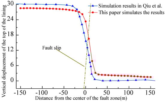Following the construction of the model, a validation process was performed by simulating the fault movement test conducted by Qiu et al. []. The vertical displacement at the top of the tunnel lining was calculated using identical material parameters. As demonstrated in Figure 5, the simulation results show a strong correlation with the findings reported in the literature. The vertical displacement exhibited a characteristic Z-shaped pattern at the tunnel crown, consistent with the deformation mode observed in Qiu et al.’s [] study. Minor discrepancies in displacement values can be attributed to the treatment of material self-weight and fault slip displacement as two distinct external loads in the simulation. These deviations are minimal and fall within an acceptable range, exerting no significant influence on the overall displacement pattern.
