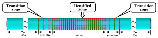 Analysis of Figure 6 reveals that the impact of reverse fault movement on the maximum principal stress of the tunnel lining is concentrated within an 80 m range around the fault slip zone. Referring to the quantitative design formula for tunnel combined seismic joints proposed by Sun’s research team [], densified combined seismic joints should be strategically arranged within this 80 m range of the fault fracture zone and its adjacent areas. To mitigate structural performance variations, a transition zone should be established over a defined length near the densified area. The specific arrangement of these seismic joints is illustrated in Figure 7.