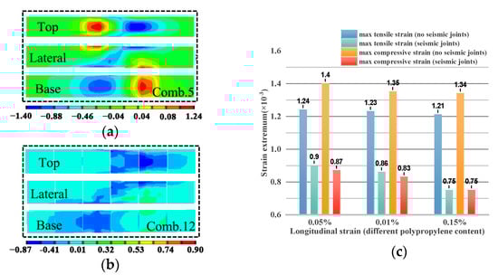 Longitudinal strain under different polypropylene fiber contents. (a) working conditions 5. (b) working conditions 12. (c) Changes in Longitudinal Strain Extremes for Working Conditions 5 and 12.