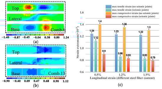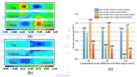 Longitudinal strain under different steel fiber aspect ratios. (a) Working Condition 6. (b) Working Condition 13. (c) Changes in Longitudinal Strain Extremes for Working Conditions 6 and 13.