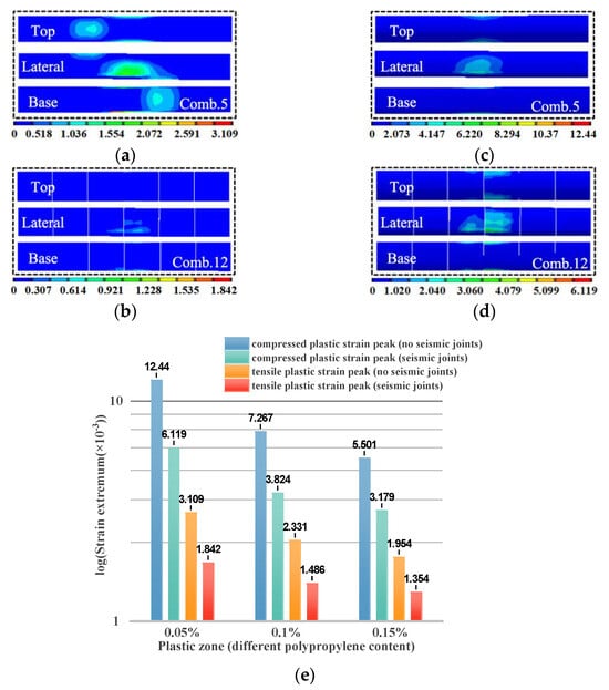 Plastic strain under different polypropylene fiber contents. (a) Working Condition 5. (b) Working Condition 12. (c) Working Condition 5. (d) Working Condition 12. (e) Variation in peak plastic strain.