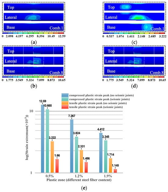 Plastic strain under different steel fiber contents. (a) Working Condition 1. (b) Working Condition 8. (c) Working Condition 1. (d) Working Condition 8. (e) Variation in peak plastic strain.