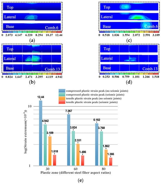 Plastic strain under different steel fiber length-to-diameter ratios. (a) Working Condition 6. (b) Working Condition 13. (c) Working Condition 6. (d) Working Condition 13. (e) Variation in peak plastic strain.
