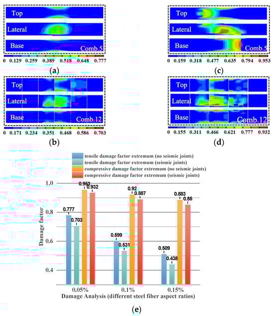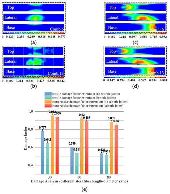 Tensile and compressive damage under different steel fiber length-to-diameter ratios. (a) Working Condition 6. (b) Working Condition 13. (c) Working Condition 6. (d) Working Condition 13. (e) Variation in extreme values of the damage factor.