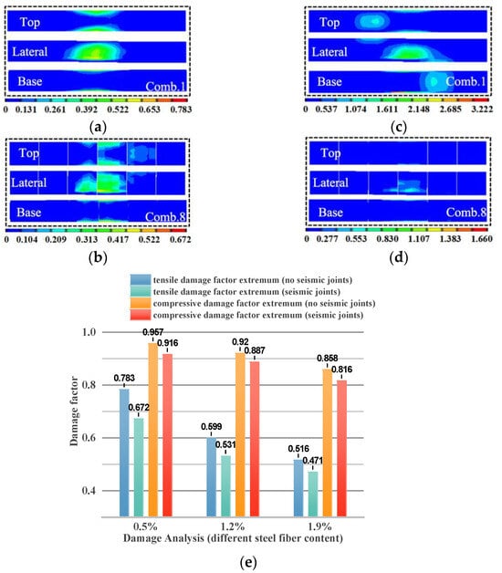 Tensile and compressive damage under different steel fiber contents. (a) Working Condition 1. (b) Working Condition 8. (c) Working Condition 1. (d) Working Condition 8. (e) Variation in extreme values of the damage factor.