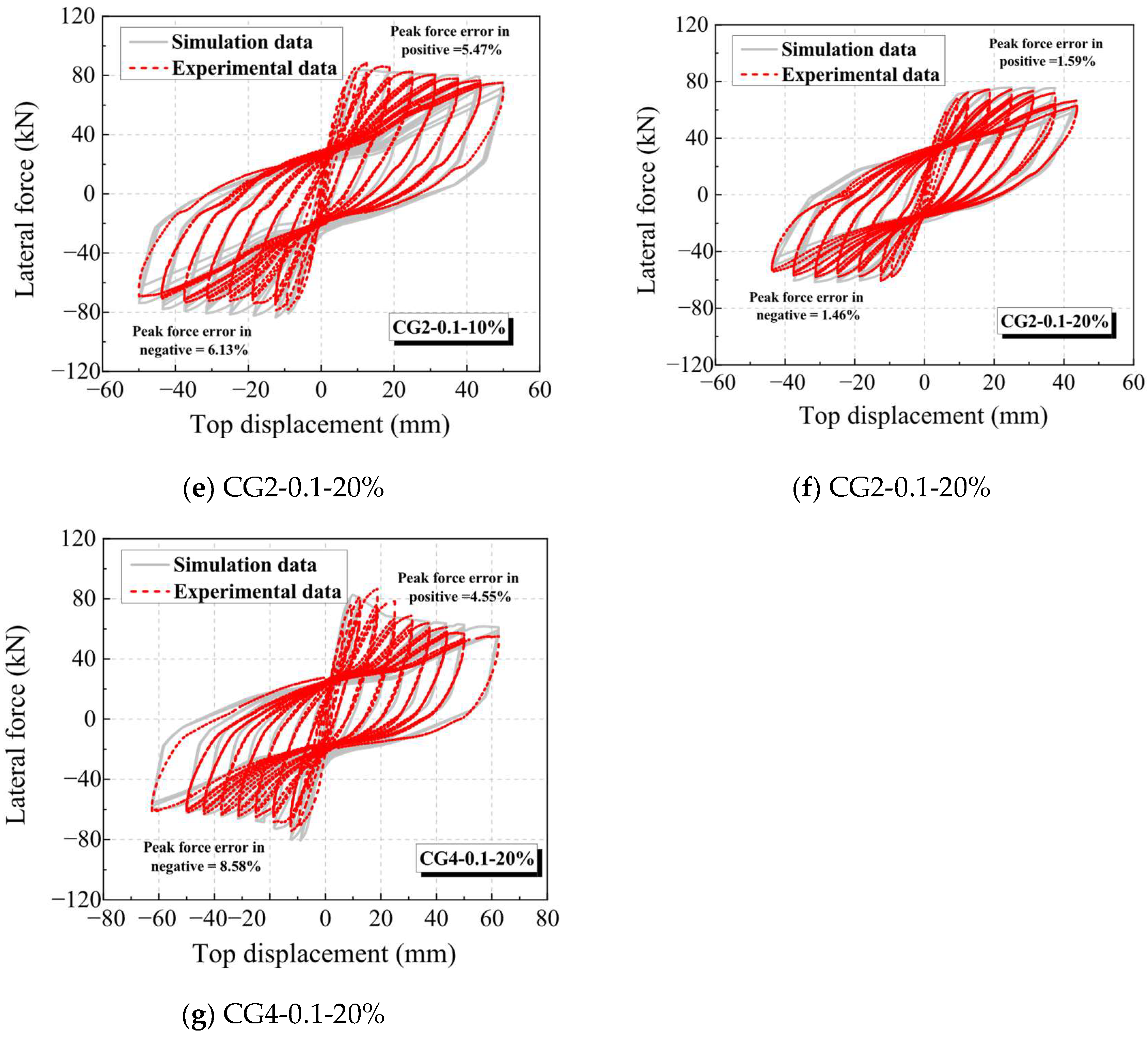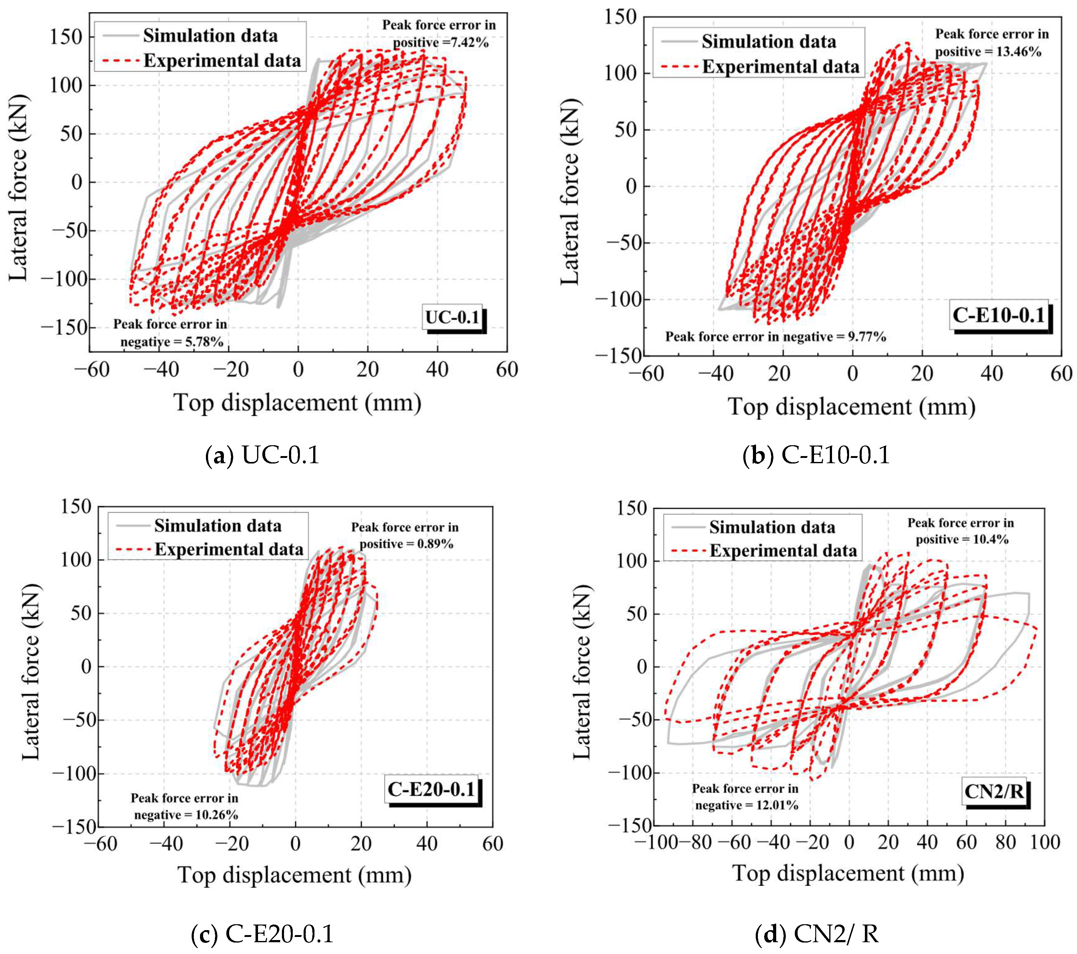 - Cao, X.; Wang, W.; Tan, X.; Zhang, Y. Seismic behaviour of pre-damaged RC columns strengthened with CFRP grid/sprayed ECC jackets subjected to horizontal reversed cyclic loading and constant axial force. Case Stud. Constr. Mater. 2024, 20, e02948. [Google Scholar] [CrossRef]