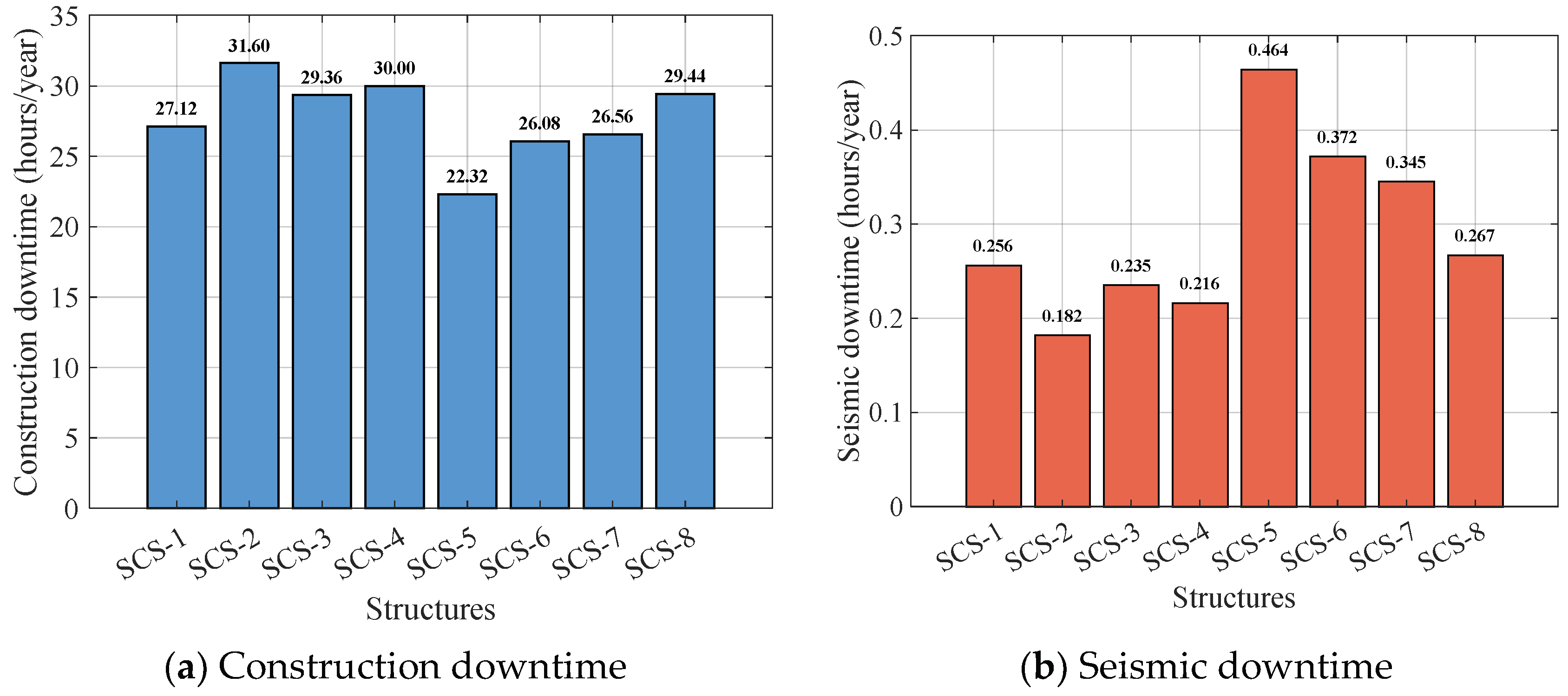 - Annual downtime (Tdown): includes both construction and earthquake-induced interruptions, reflecting resilience and functional recovery capacity.