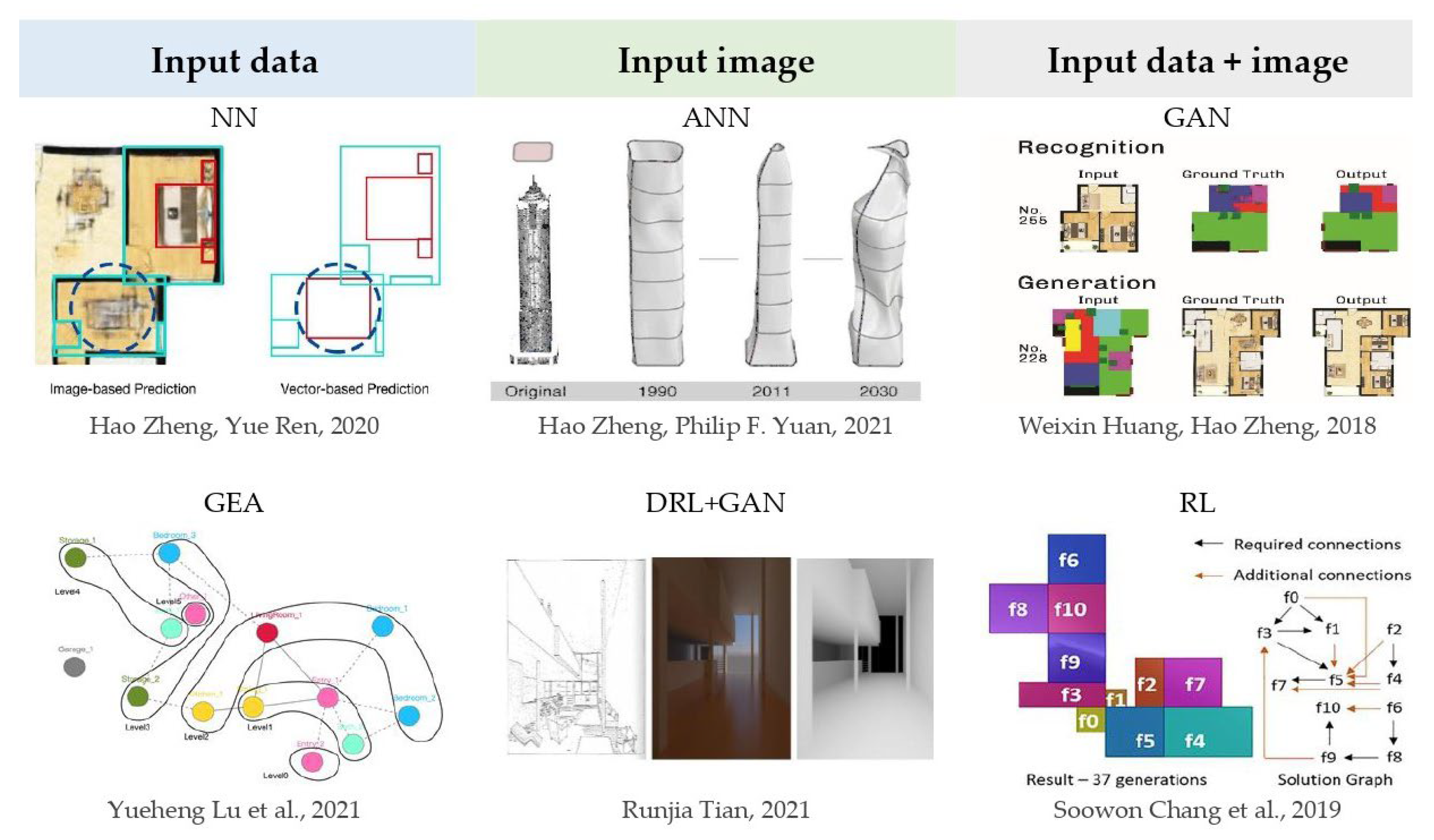 - Liu, Y.; Zhang, Z.; Deng, Q. Exploration on diversity generation of campus layout based on GAN. In Hybrid Intelligence; Yuan, P.F., Chai, H., Yan, C., Li, K., Sun, T., Eds.; Springer Nature: Singapore, 2023; pp. 233–243. [Google Scholar] [CrossRef]