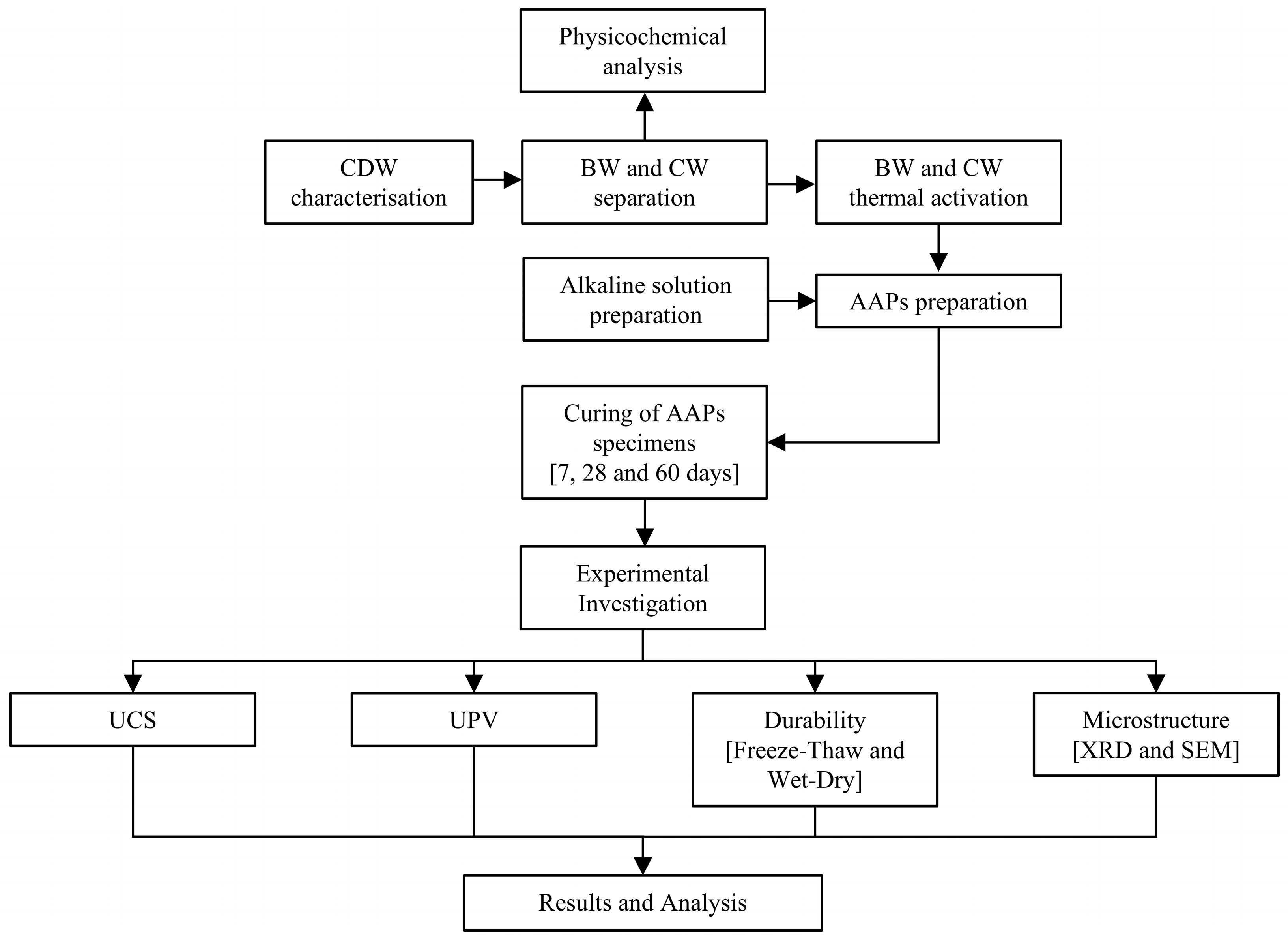 | Mixed CDW | 10% OPC c | 25 °C, RH ≈ 80%,  90 days, Si/Na = 0.34  | NaOH + Na2SiO3 | UCS: 44 MPa | Binder, Concrete, Structural Blocks | [47] |