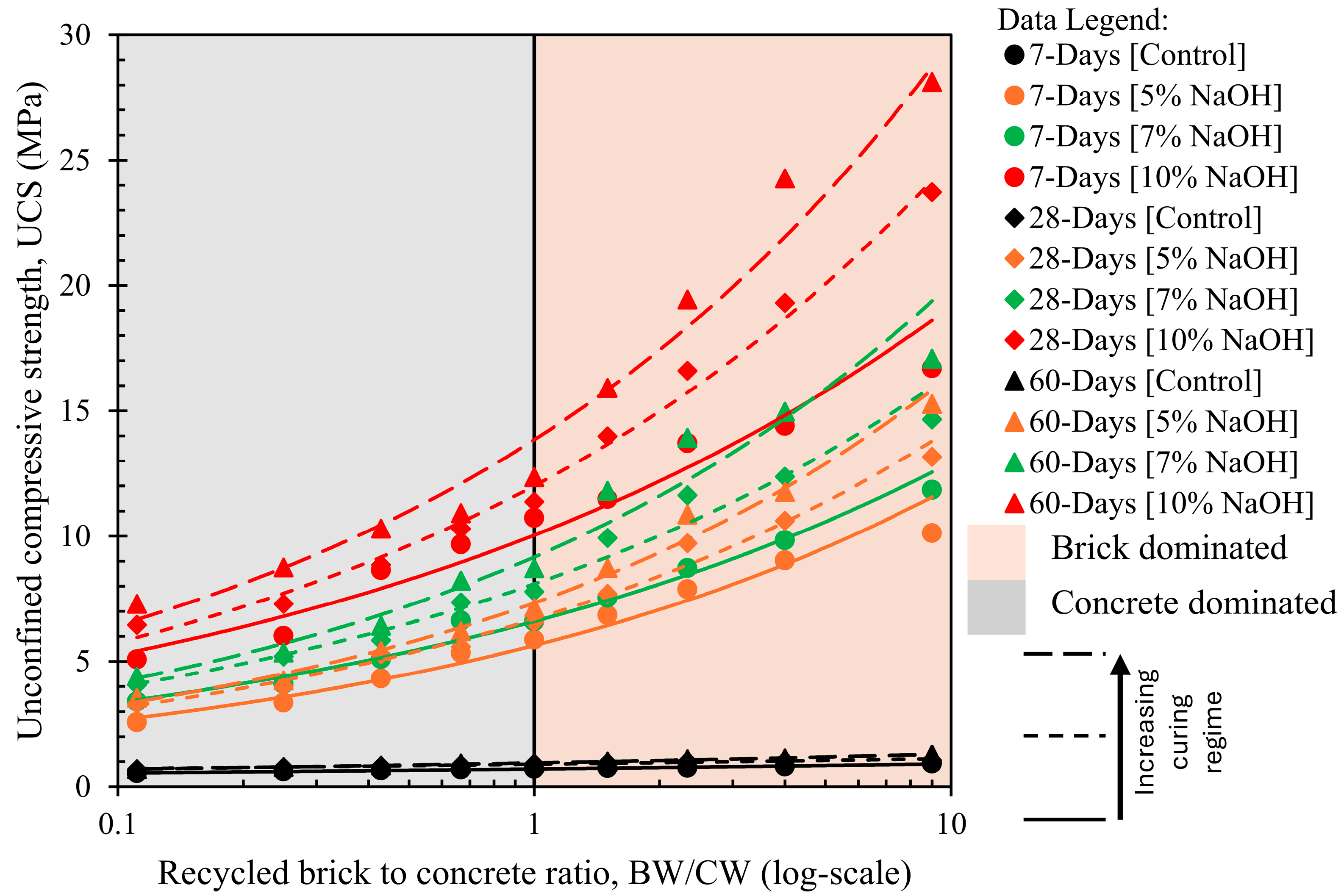 - Strength Behaviour: The compressive strength followed a power-law relationship with recycled brick content, driven by an increase in reactive surface area and enhanced gel formation. The NaOH content exhibited a linear effect on strength, resulting from proportional increases in precursor dissolution.