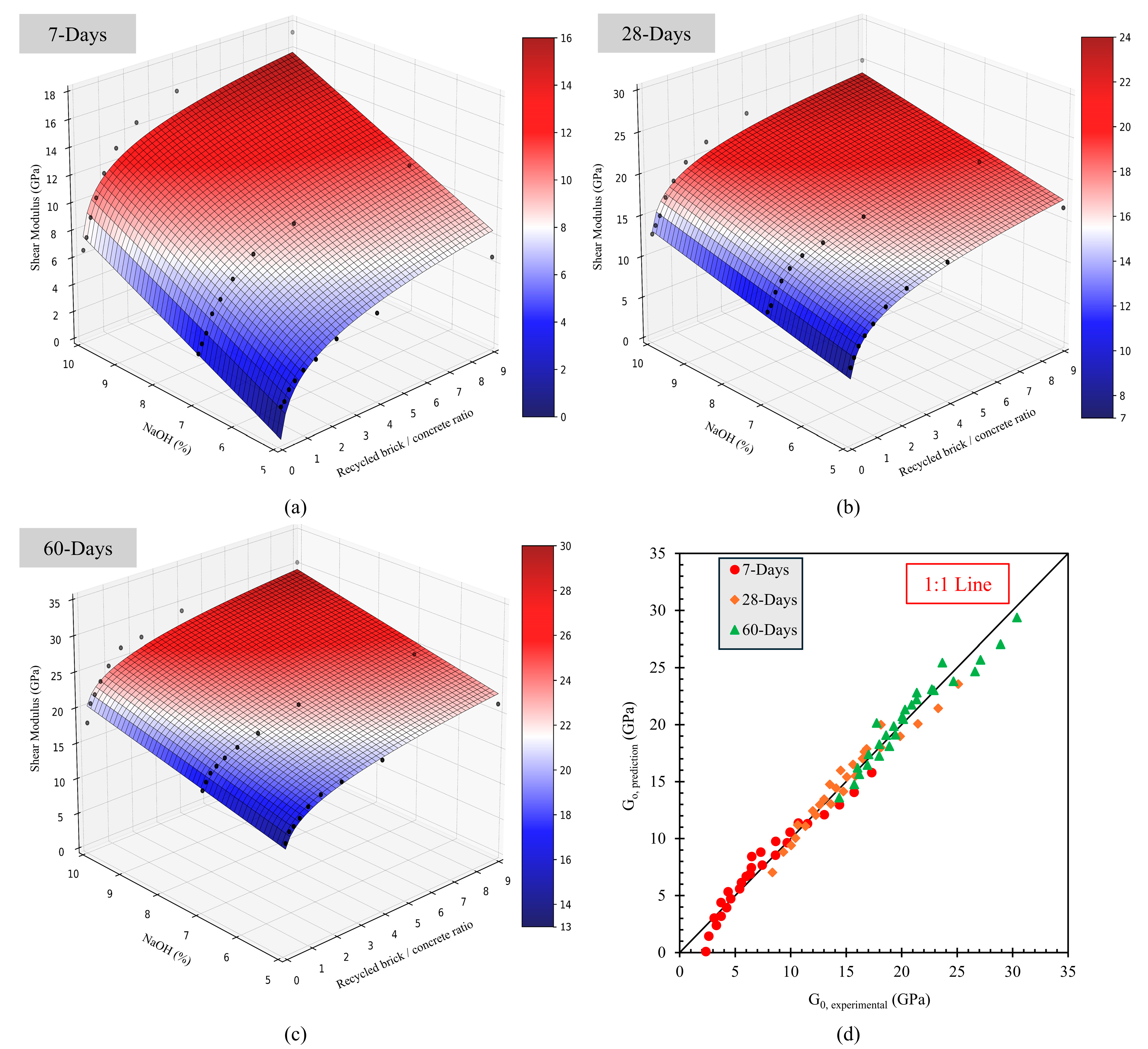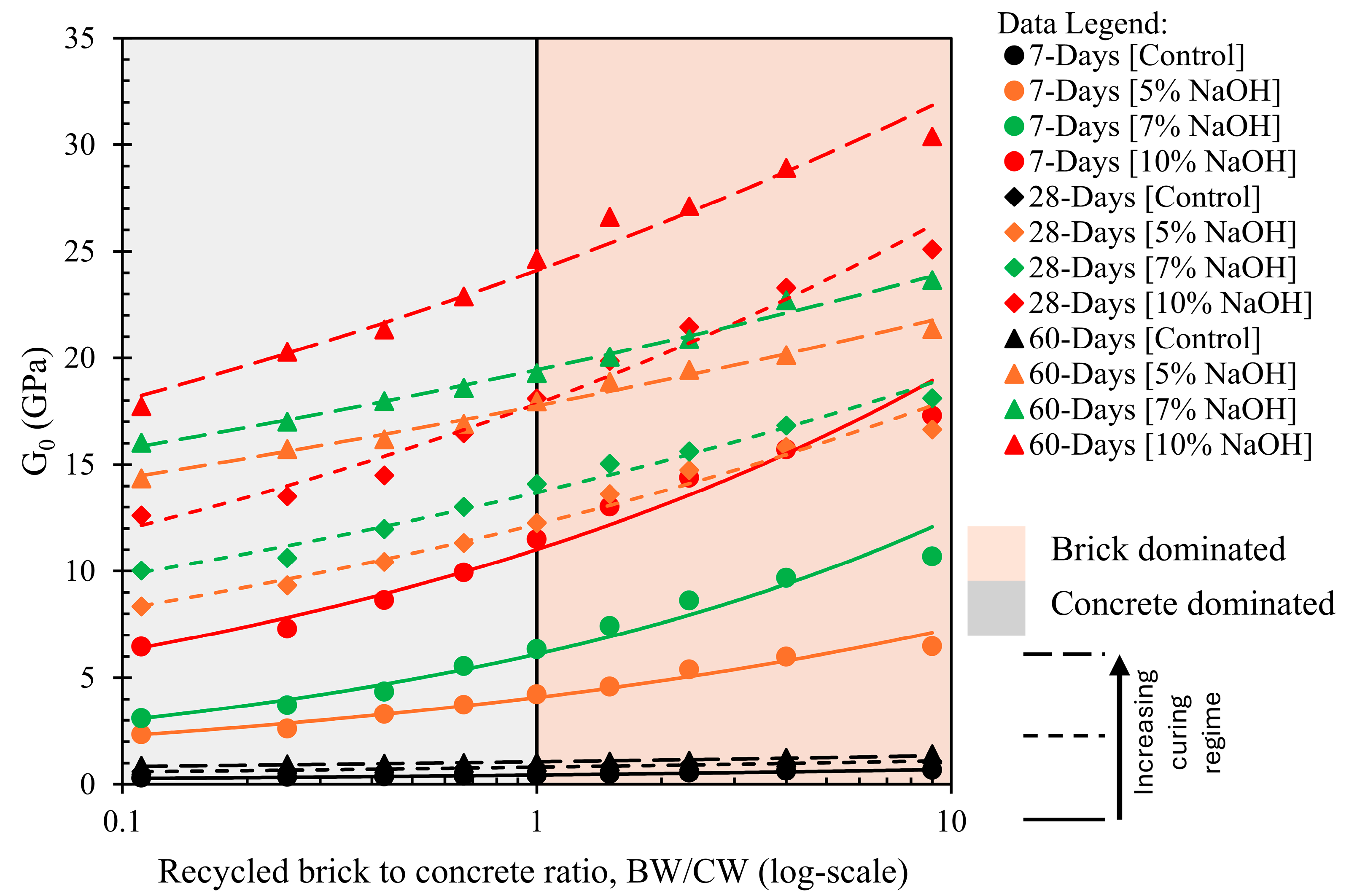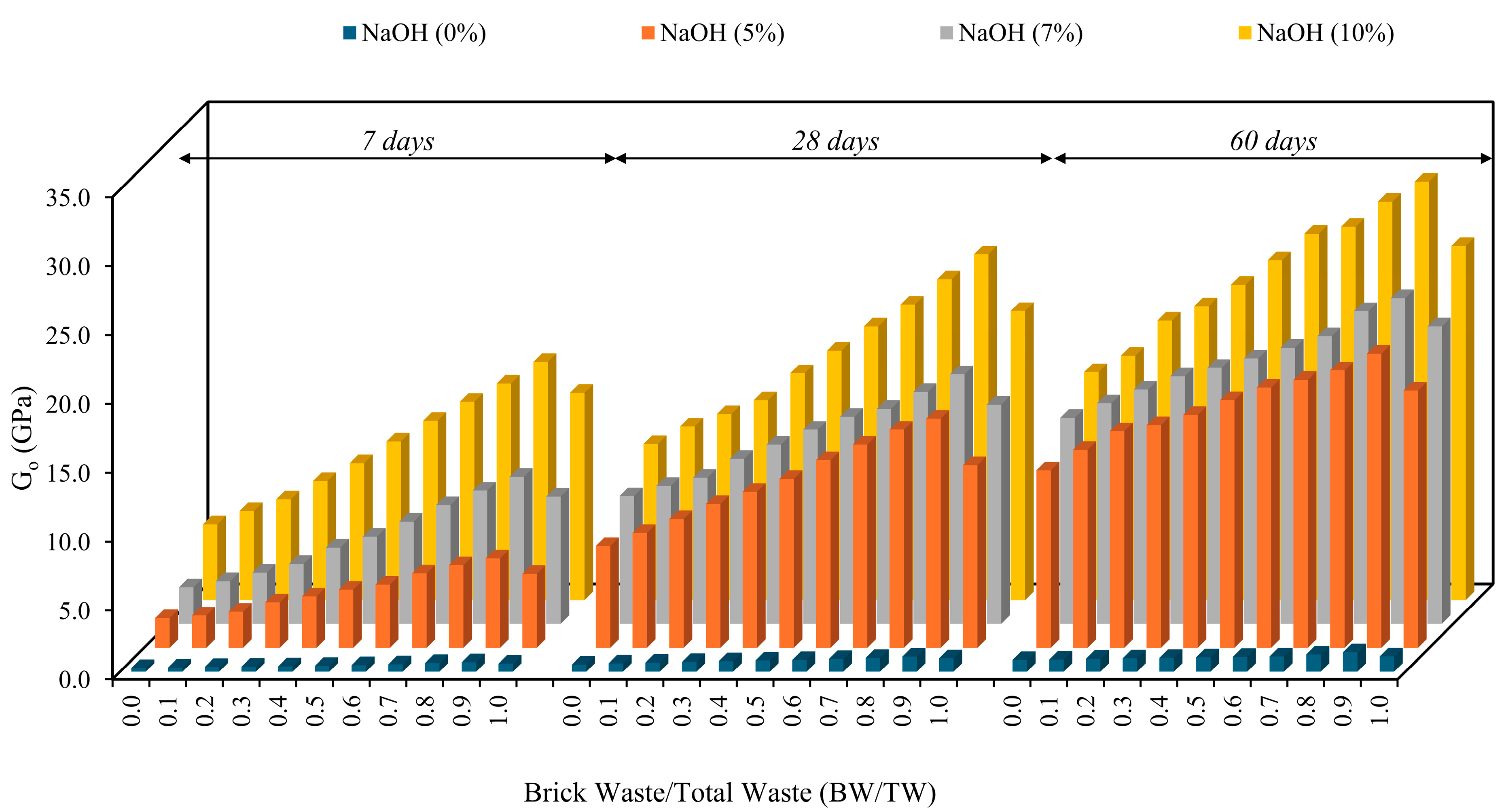 - Stiffness Gains: The shear modulus increased with NaOH concentration across all BW/TW ratios and curing periods. After 60 days with a BW/TW ratio of 0.9, Go reached 21, 23, and 30 GPa for 5%, 7%, and 10% NaOH, respectively, confirming enhanced stiffness with stronger activation.