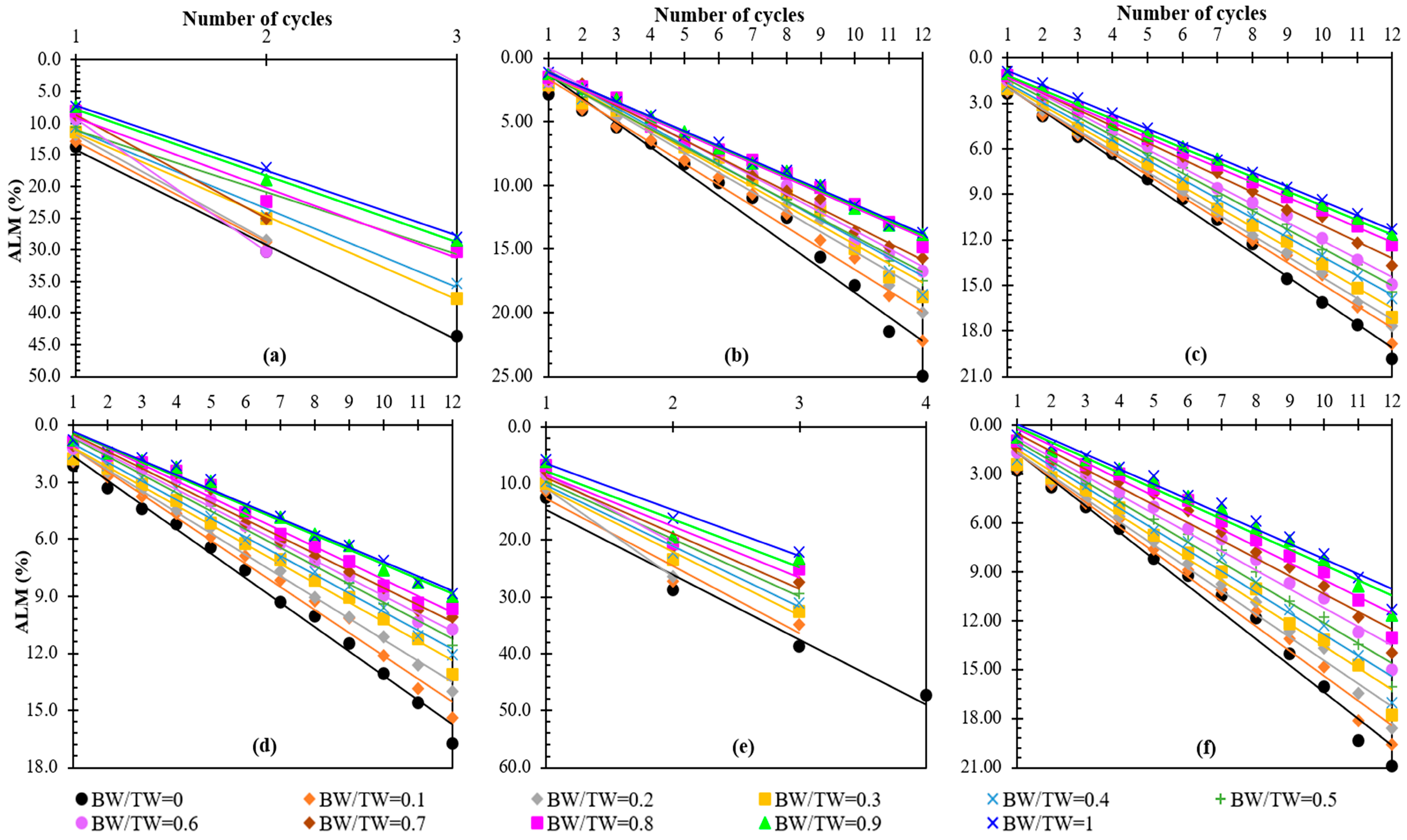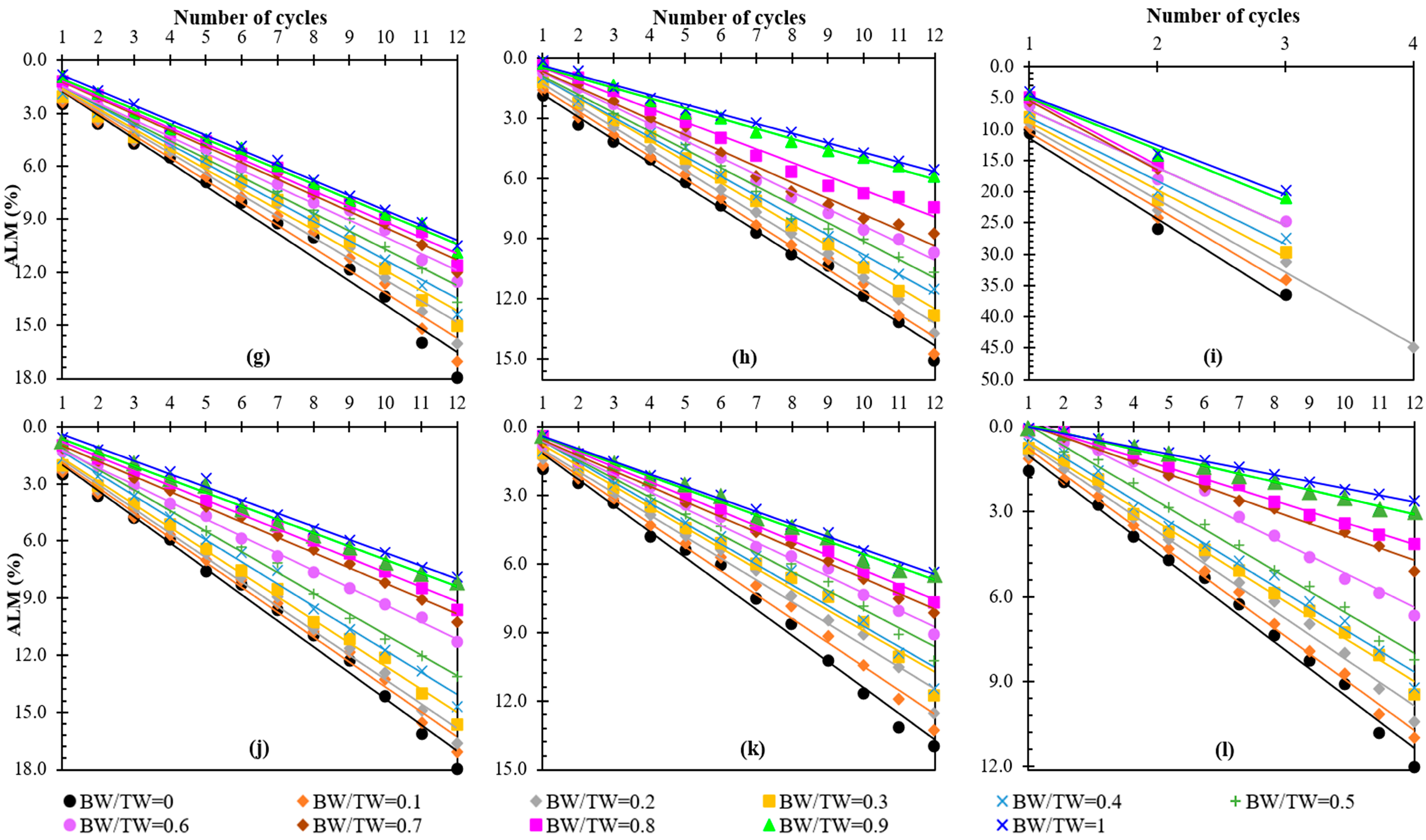- Wet–Dry Durability: Control mixes degraded rapidly (ALM 20–35%) and failed within 2–5 cycles. Conversely, AAPs completed all 12 cycles with an ALM as low as 1.96% at 10% NaOH.