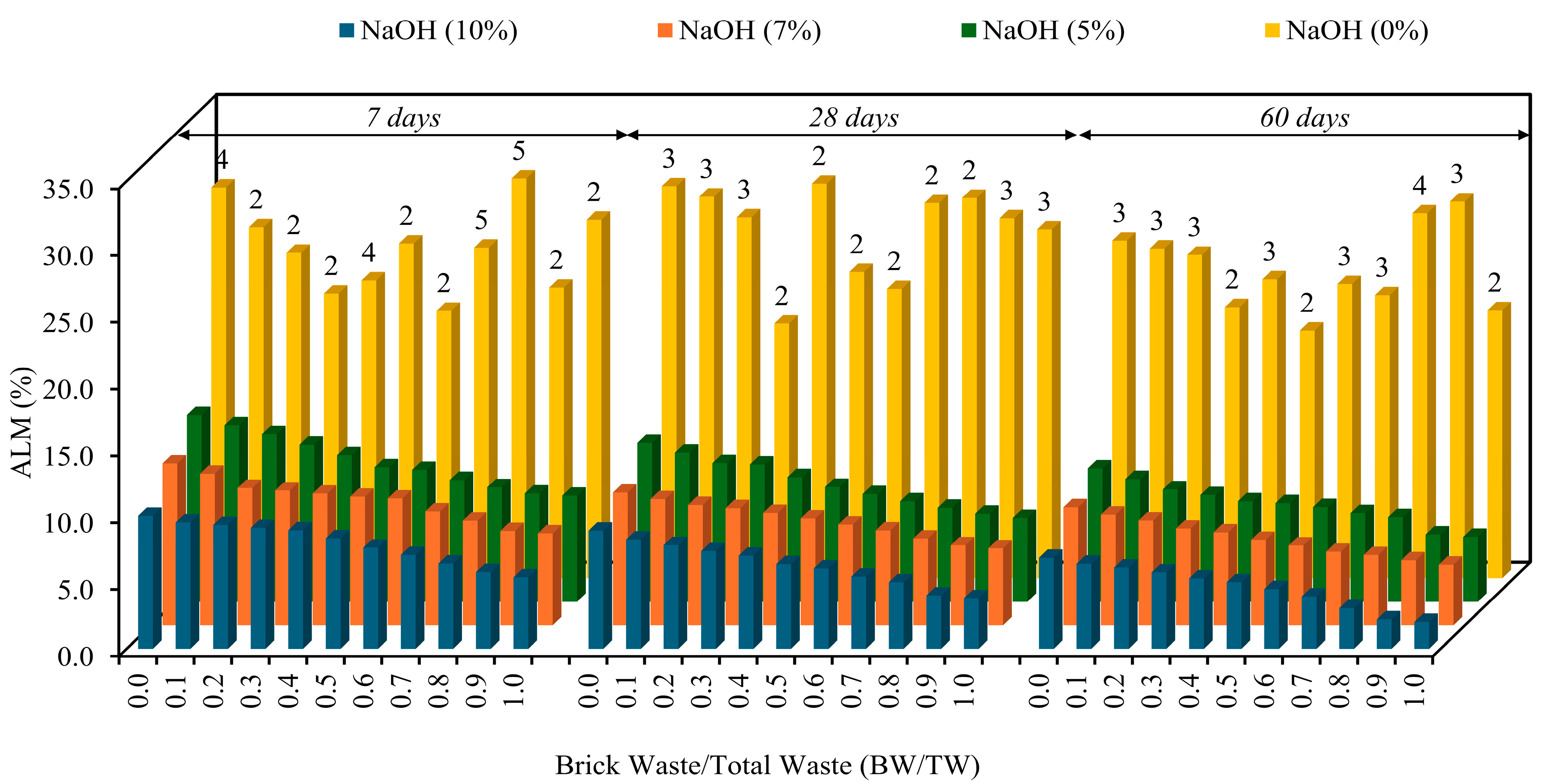 - Freeze–Thaw Durability: Control mixes failed within 2–4 cycles due to the absence of alkali activation. In contrast, AAPs completed all 12 cycles with significantly reduced ALM. The lowest ALM, 2.6%, occurred with 10% NaOH.