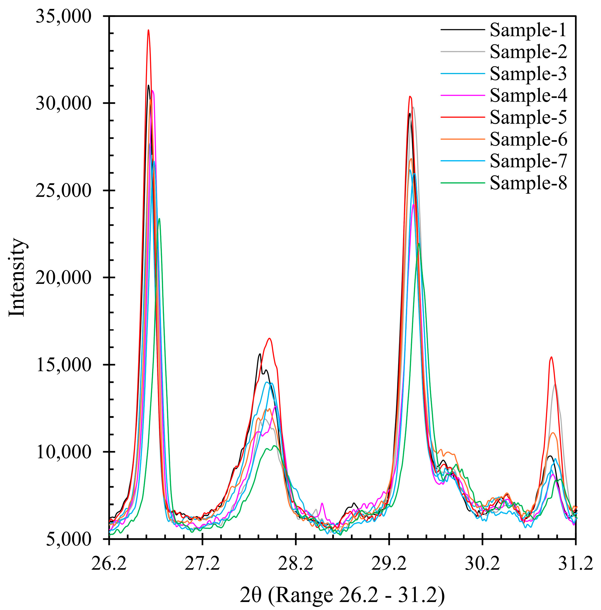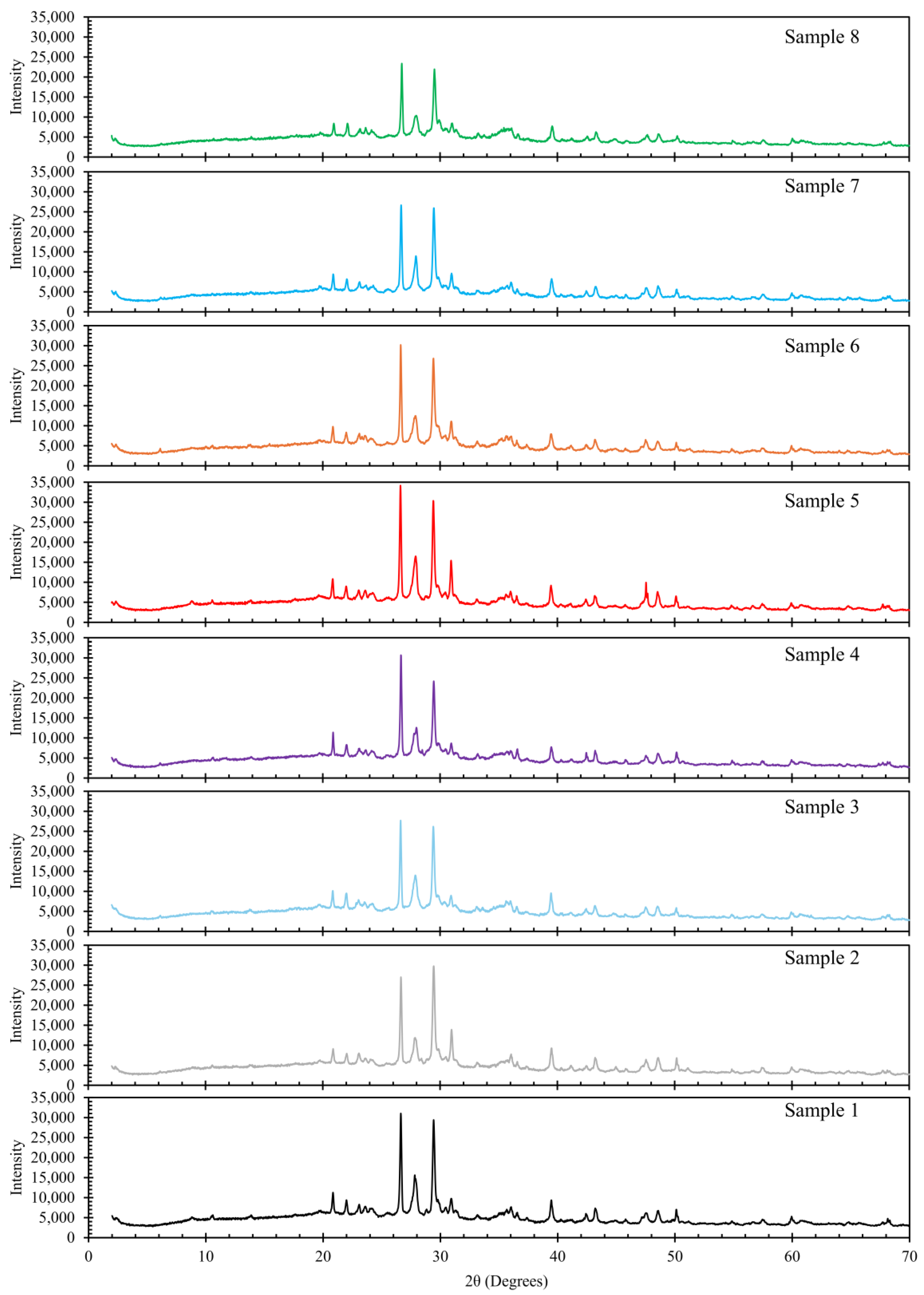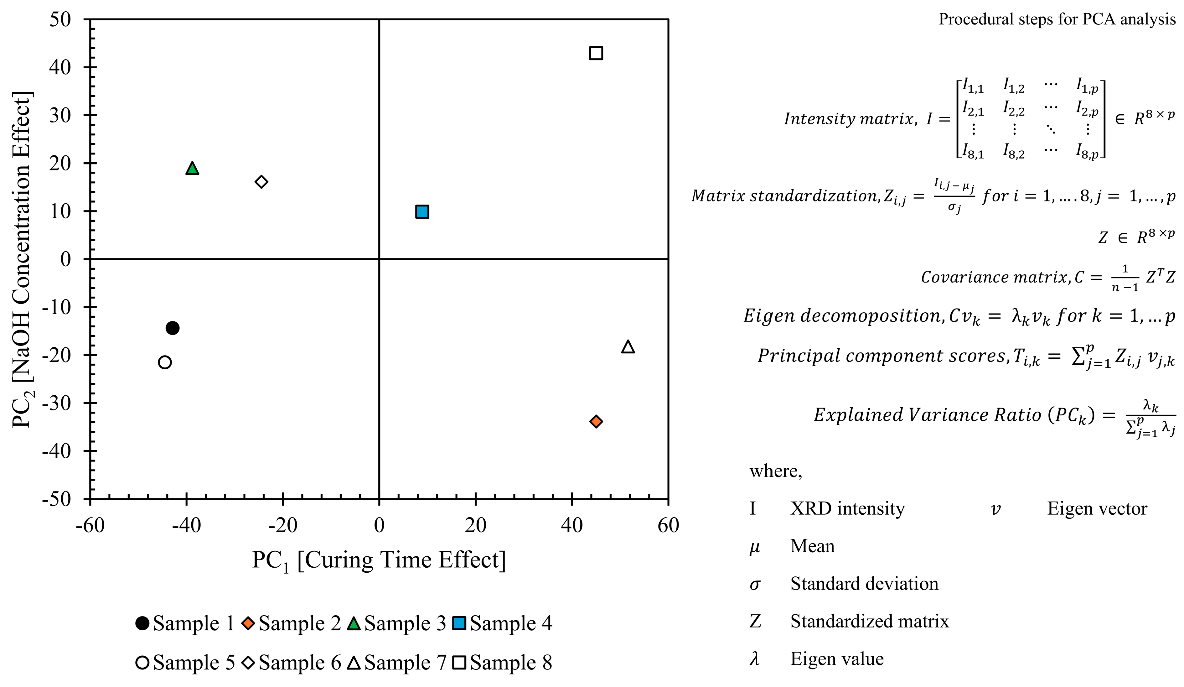 - Microstructural Evolution: XRD analysis confirmed the progressive mineralogical transformations that occurred with increasing NaOH content, particularly at a BW/TW ratio of 0.9. The formation of N-A-S-H and C-A-S-H phases, along with sharper peaks at 10% NaOH, indicates improved structural integrity and long-term stability. Principal component analysis of XRD data revealed distinct clustering based on curing time and NaOH content. High-alkali, long-cured samples exhibited advanced phase development, with Sample 8 (10% NaOH, 60 days) showing the greatest crystallinity.