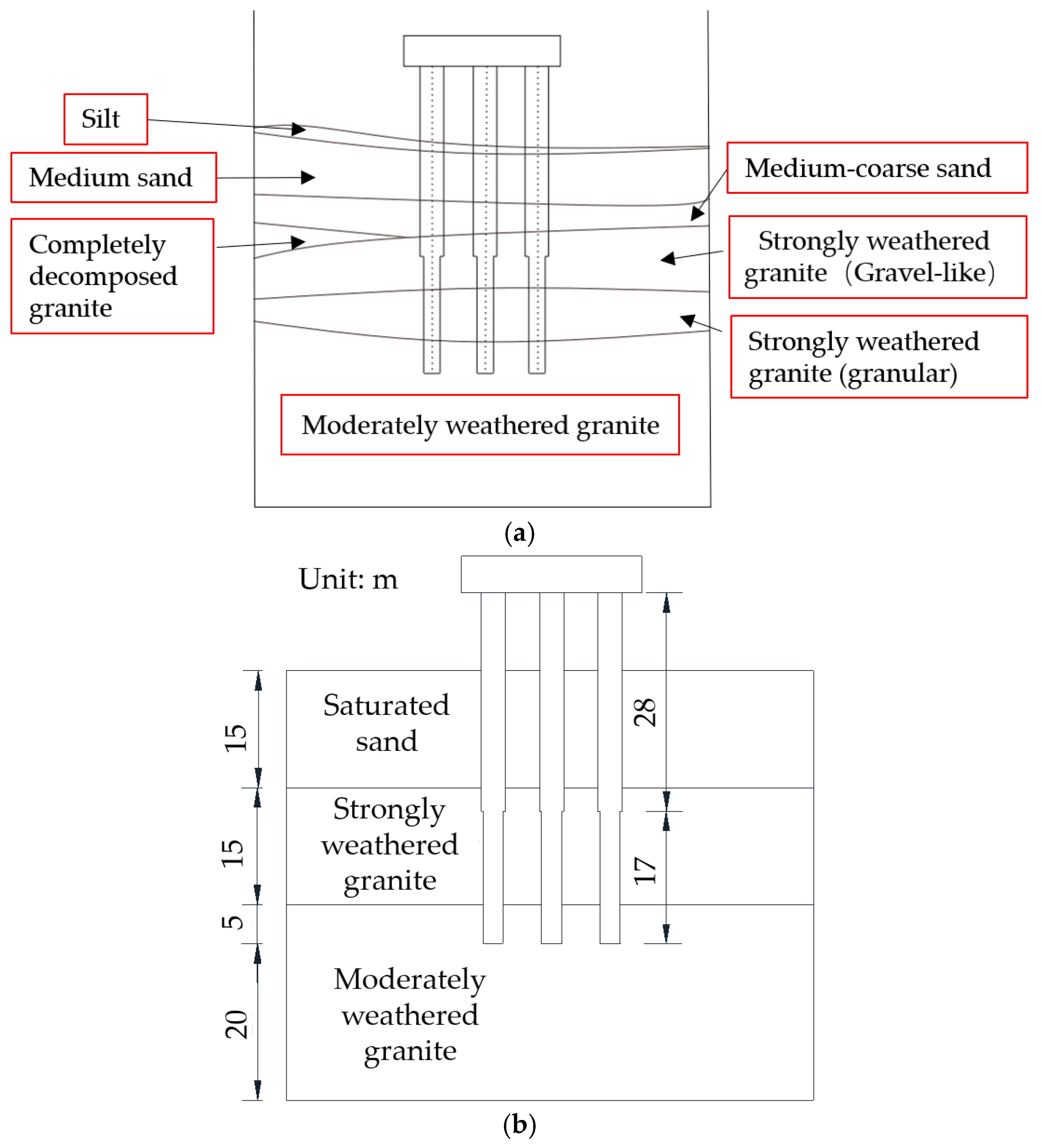 Geological exploration data from the Xiang’an Bridge site indicate that the foundation soil consists primarily of saturated fine sand overlying strongly weathered granite. The undisturbed sandy soil has a natural density of 1.89 g/cm
