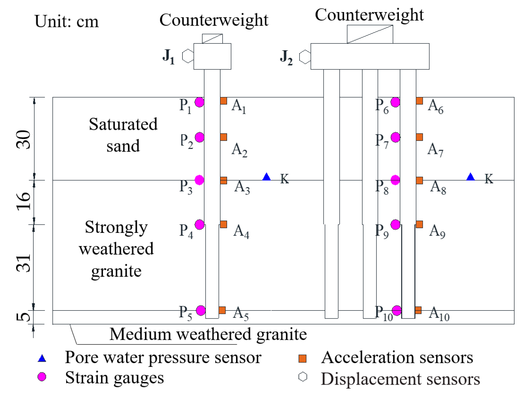 The experiment utilizes pore water pressure gauges, acceleration sensors, strain gauges, and displacement sensors. Pore water pressure gauges are positioned in the soil surrounding the pile to measure the pressure. Acceleration sensors, attached to the pile with rubber bands, gauge the pile’s acceleration due to seismic inertia. Strain gauges are placed at soil layer interfaces, the midpoint of the saturated sand layer, the bedrock surface, the pile top, and variable cross-section locations to assess pile strain under seismic loads, facilitating the calculation of the bending moment. Displacement sensors, secured with plasticine on the pile top, measure horizontal displacement changes under seismic conditions. The arrangement of these components is depicted in