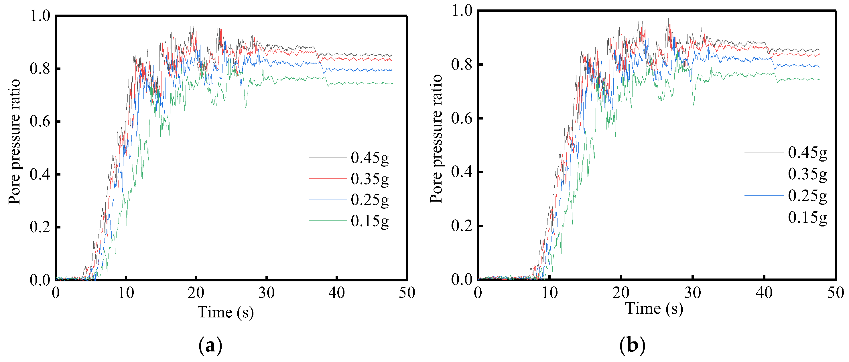 Figure 8 illustrates that the pore pressure ratio exhibits similar variation patterns across different ground motion intensities. Initially, upon seismic wave loading, the pore pressure ratio is near zero. As seismic intensity escalates, the ratio rises gradually before stabilizing. Complete soil liquefaction occurs when the ratio reaches 0.8. For a pile group foundation, the stable pore pressure ratios increase with seismic intensity. Specifically, at intensities of 0.15, 0.25, 0.35, and 0.45 g, the stable ratios are 0.72, 0.80, 0.84, and 0.86, respectively. This trend is attributed to the inability of pore water pressure to dissipate rapidly in saturated sand layers as seismic intensity increases, leading to higher stable pore pressure ratios.