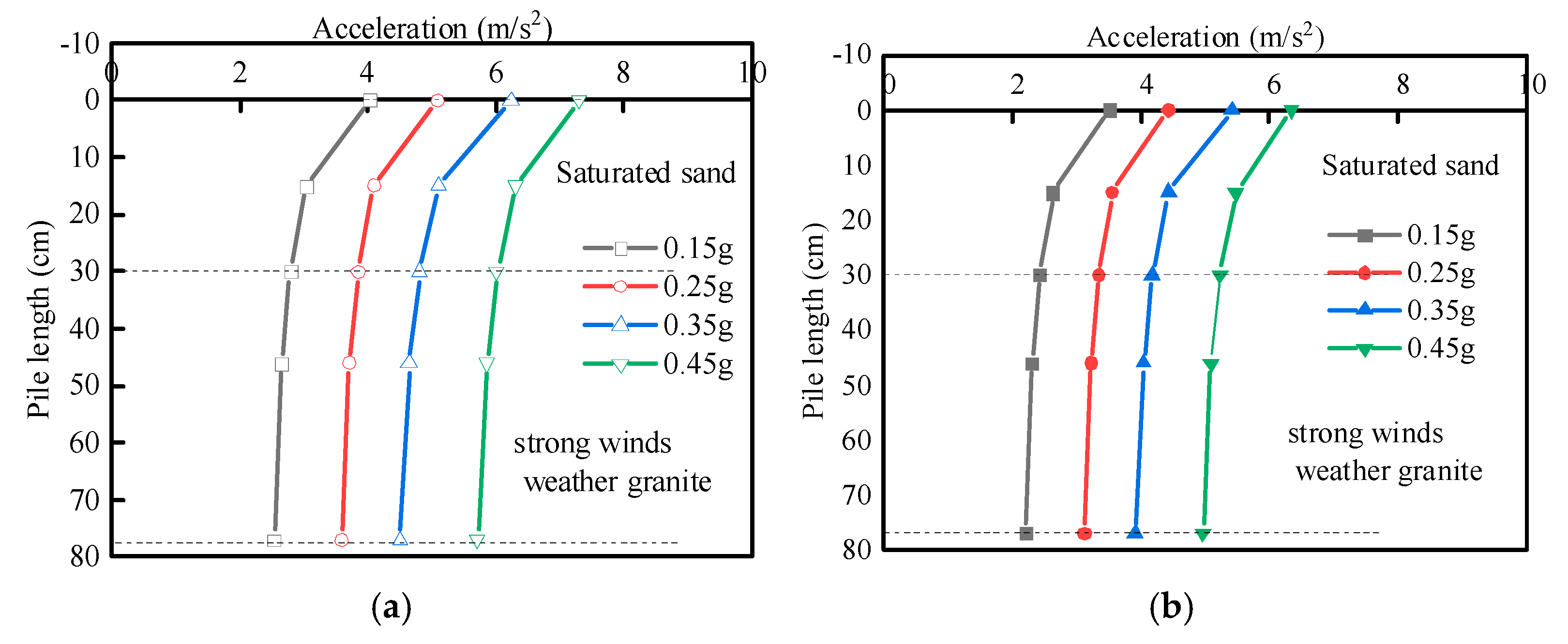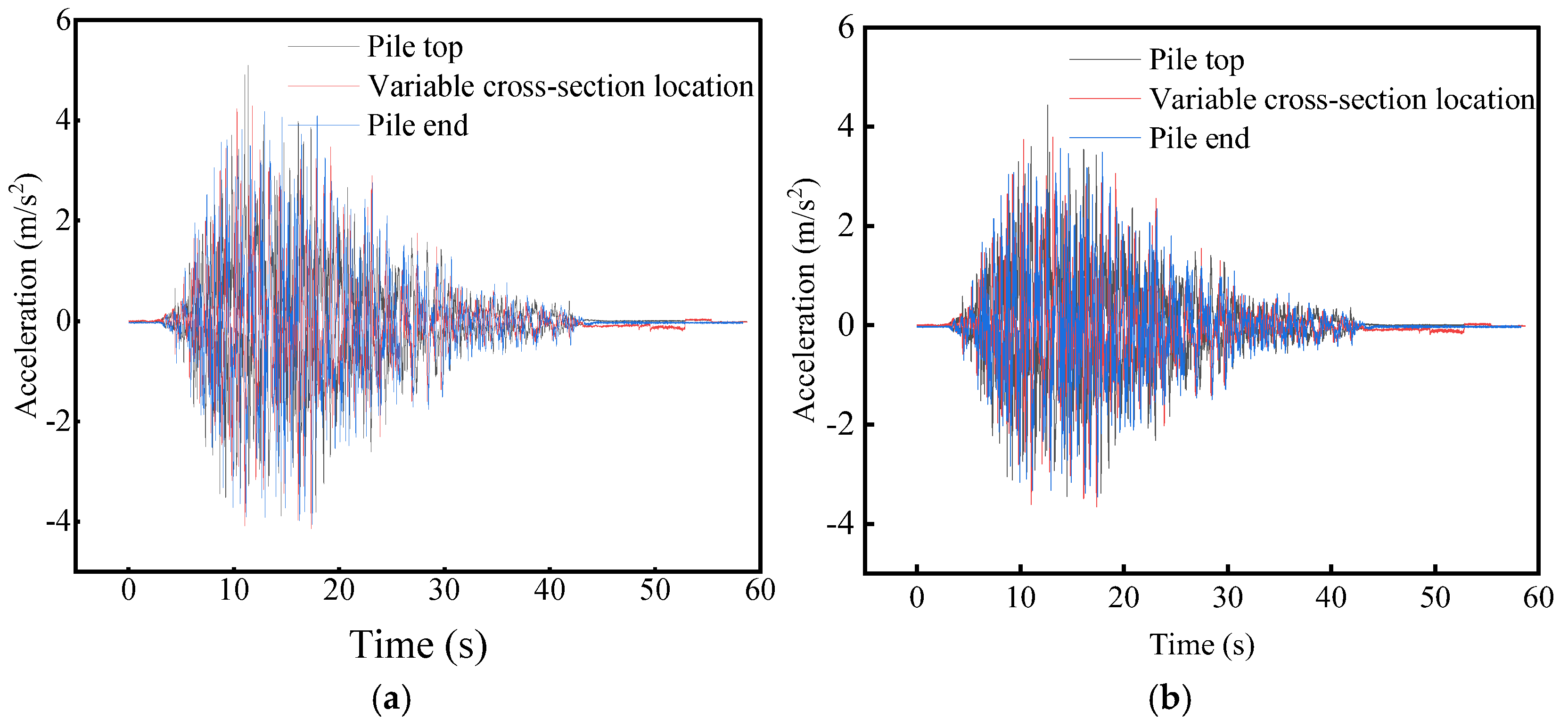 Acceleration time history curves: (a) Single pile, (b) Group piles.