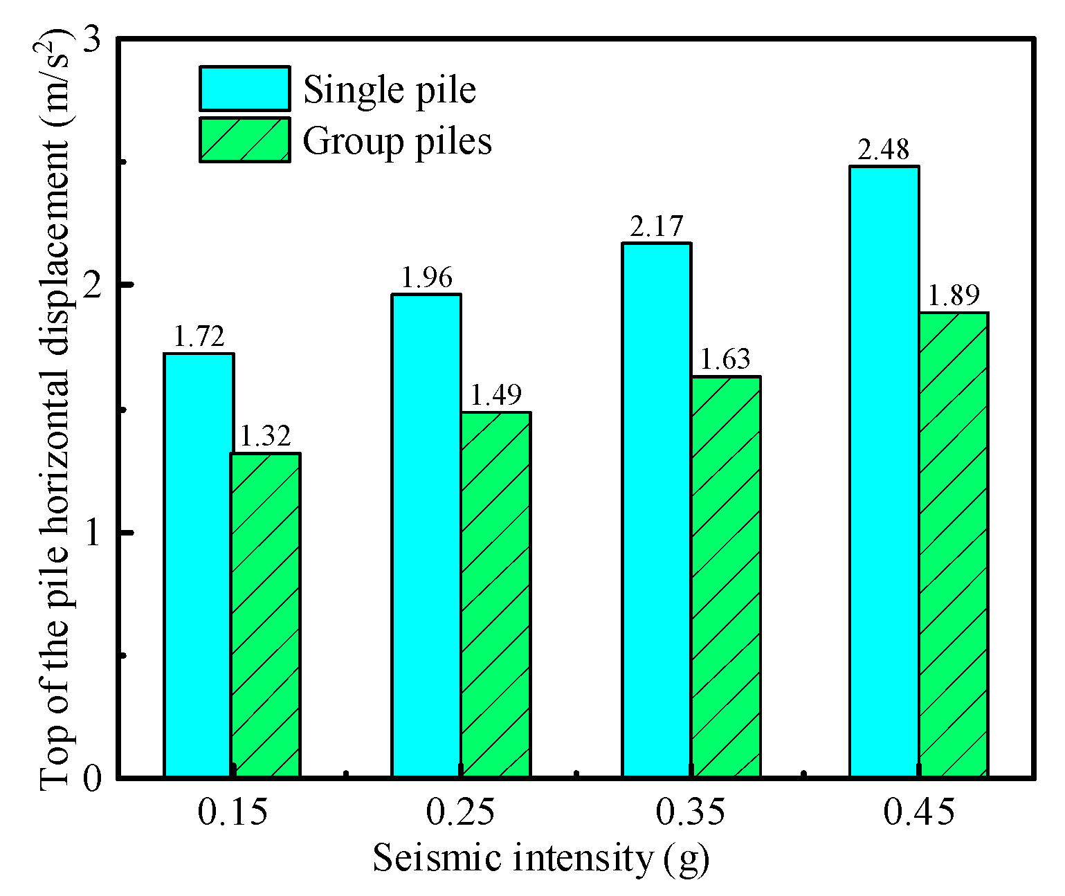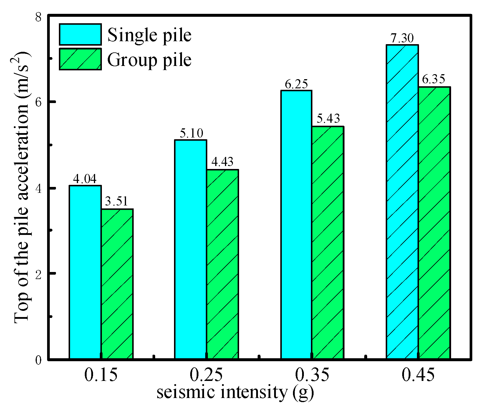 2, respectively, and those of the pile group foundation are 3.51, 4.43, 5.43, and 6.35 m/s