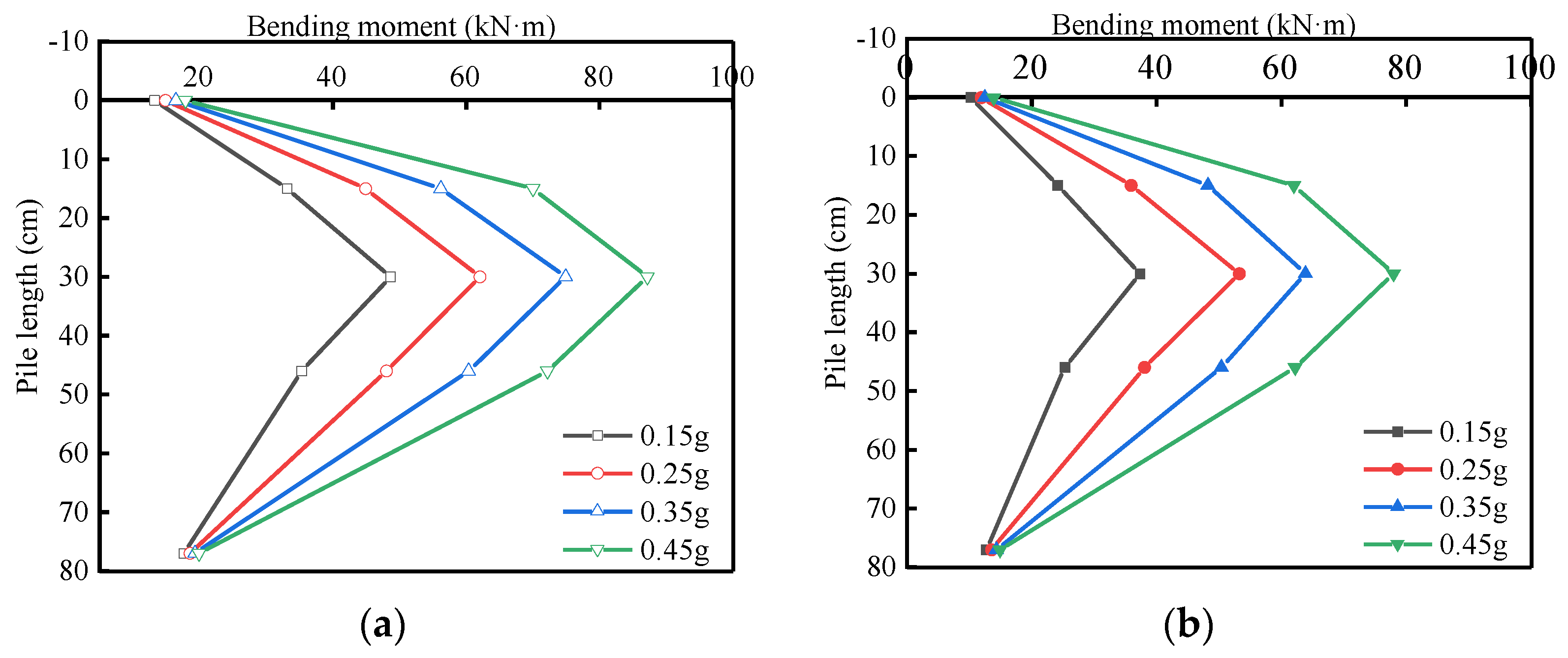 Figure 15, as seismic intensity ranges from 0.15 g to 0.45 g, the peak bending moments progressively rise. For a single pile foundation, the maximum bending moments are 48.65, 62.08, 74.96, and 87.21 kN·m, while for a group pile foundation, they are 37.38, 53.23, 63.86, and 78.01 kN·m, respectively.