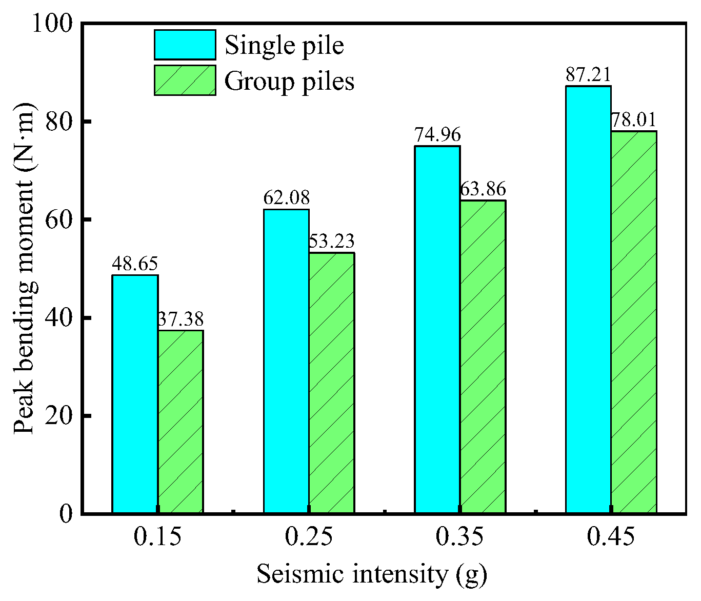 The maximum bending moment occurs at the interface between liquefied and non-liquefied layers. At 0.25 g, the peak bending moments are 62.08 kN·m (single pile) and 53.23 kN·m (pile group), indicating the improved flexural resistance of the pile group system.