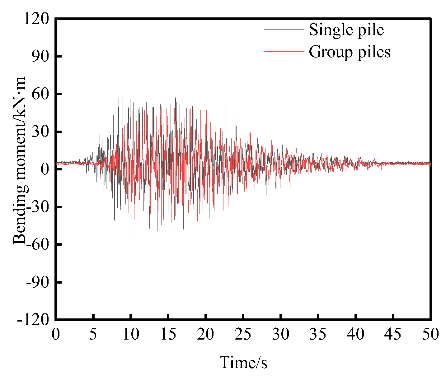 Figure 16 illustrates the time-history curves of maximum bending moment locations for large-diameter, variable-cross-section single and group pile foundations. The maximum bending moment amplitude is notably high between 5 and 30 s, with significant bending moments persisting throughout the earthquake. After 30 s, the bending moment gradually diminishes to zero, indicating that no residual bending moment remains once the earthquake ceases. Under seismic wave influence, the peak bending moments for the single and group piles occur at 18.14 s and 20.01 s, respectively.
