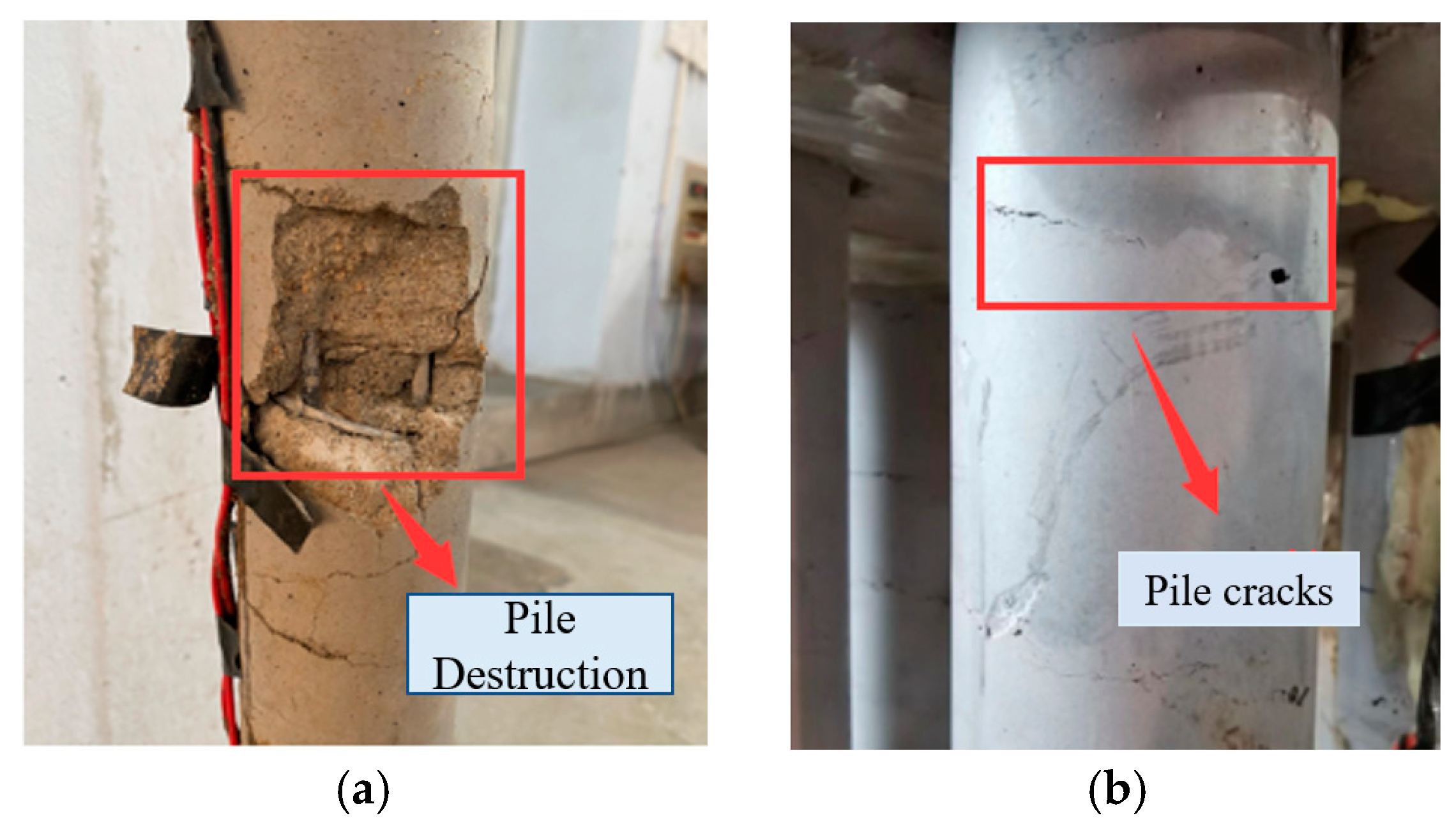 Pictures of damage to the pile foundation: (a) Single pile, (b) Group piles.